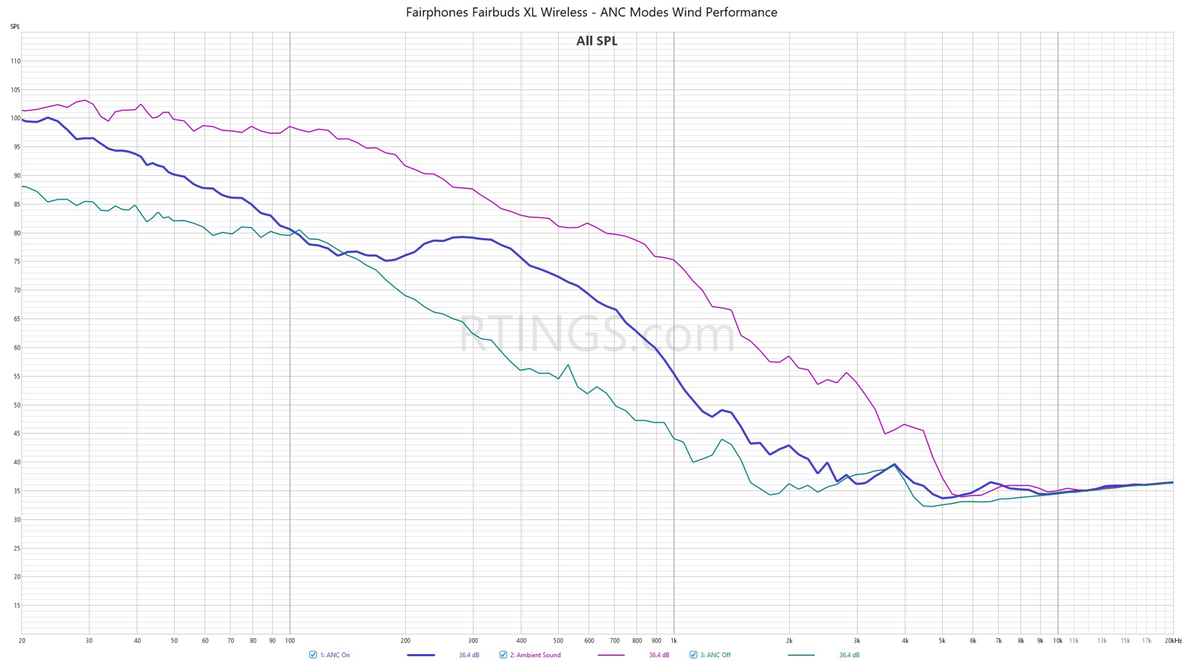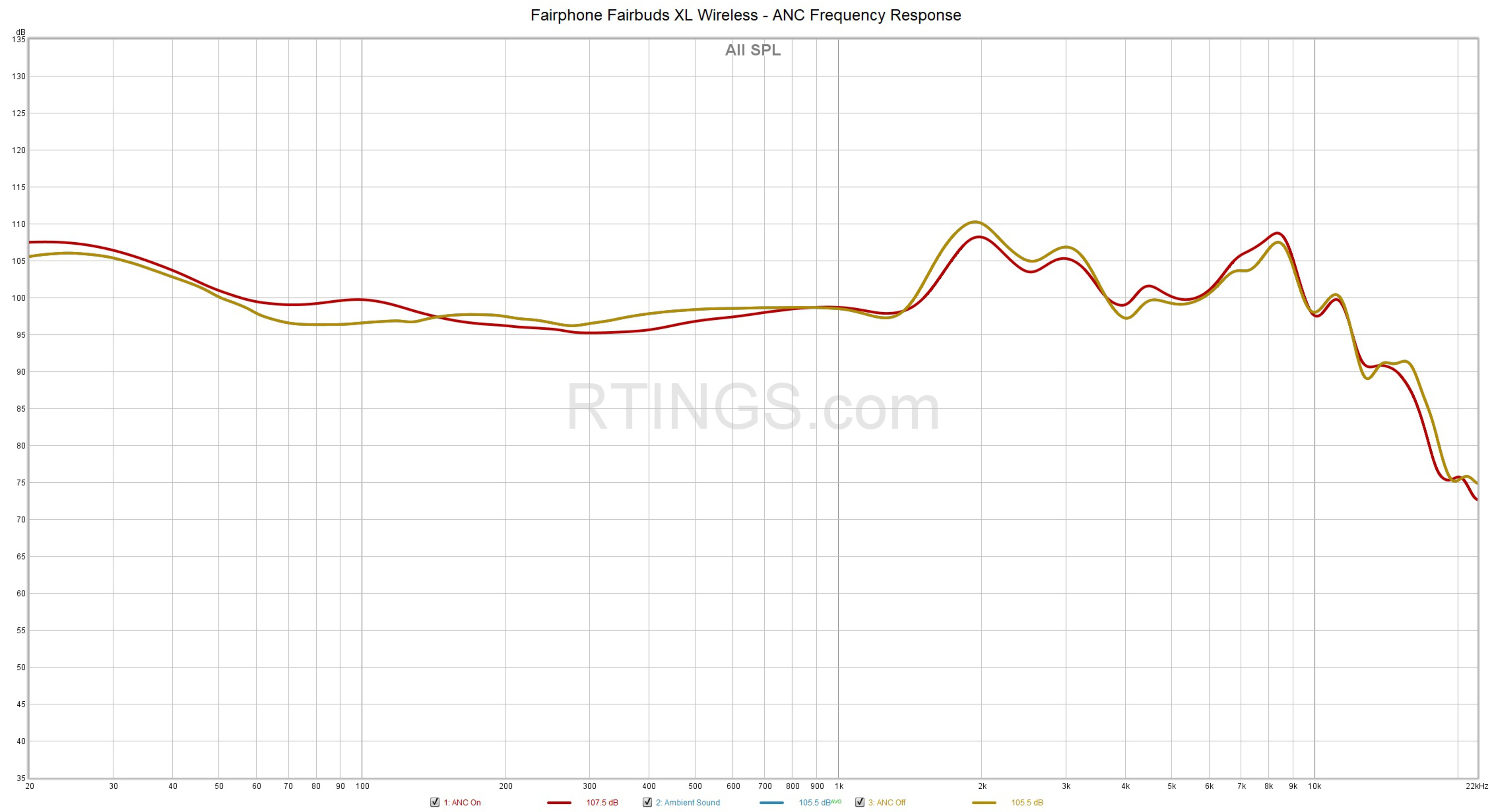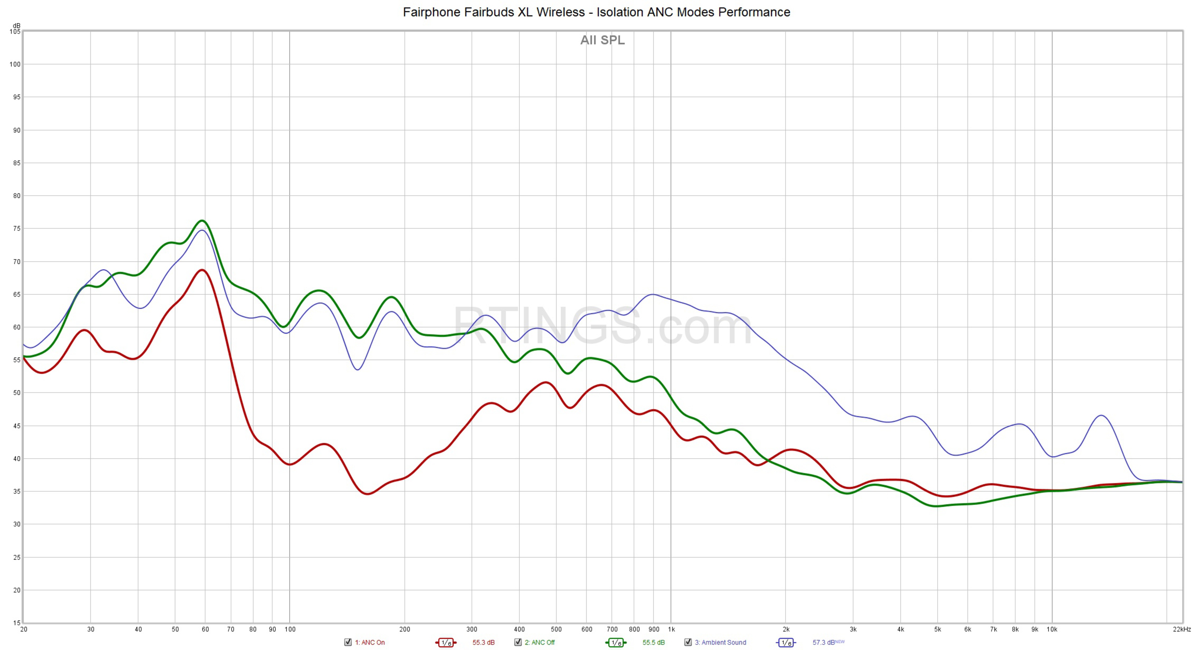 The Fairphone Fairbuds XL have an excellent full-range noise isolation performance. Considering that Fairphone is a relative newcomer to the headphones space compared to legacy brands with high-tier ANC technology like Sony and Bose, the combination of the ANC system and their passively isolating design does a great job of cutting out external mid and treble range noise. While they do a less impressive job of cutting out bass frequencies, they'll still provide some respite from sounds like bus engines rumbling. The ANC button on the ear cup lets you choose between ANC on, off, or Ambient Sound mode, which filters in some external noise. You can see how these different settings affect the noise isolation performance here.