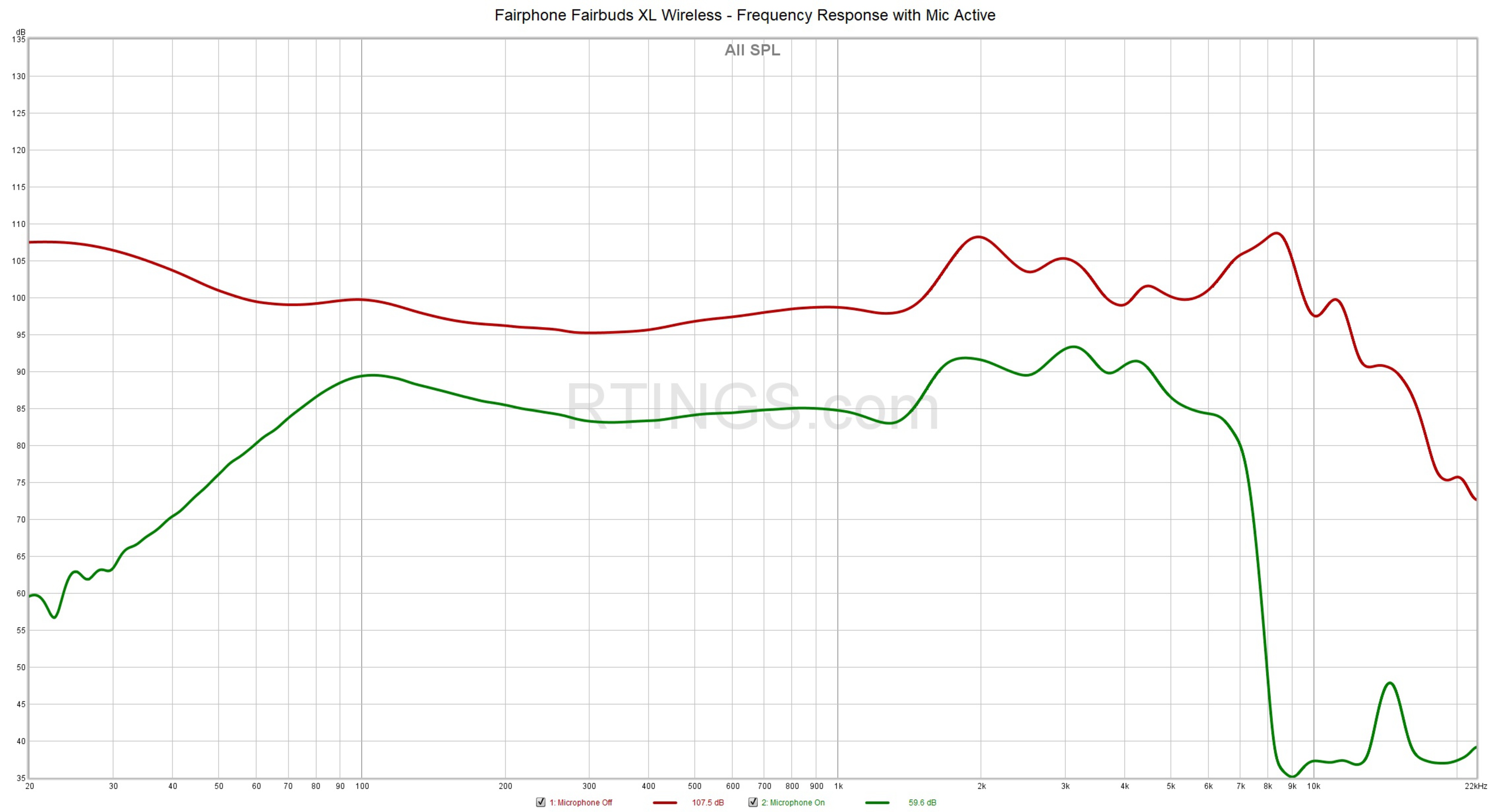 The Fairphone Fairbuds XL have an okay weighted harmonic distortion performance. There's a bump in both drivers in the mid-range, both at regular and elevated listening volumes. It's tough to notice in real-life audio content, and other frequencies fall within good levels, so audio reproduction is mostly clear and pure.