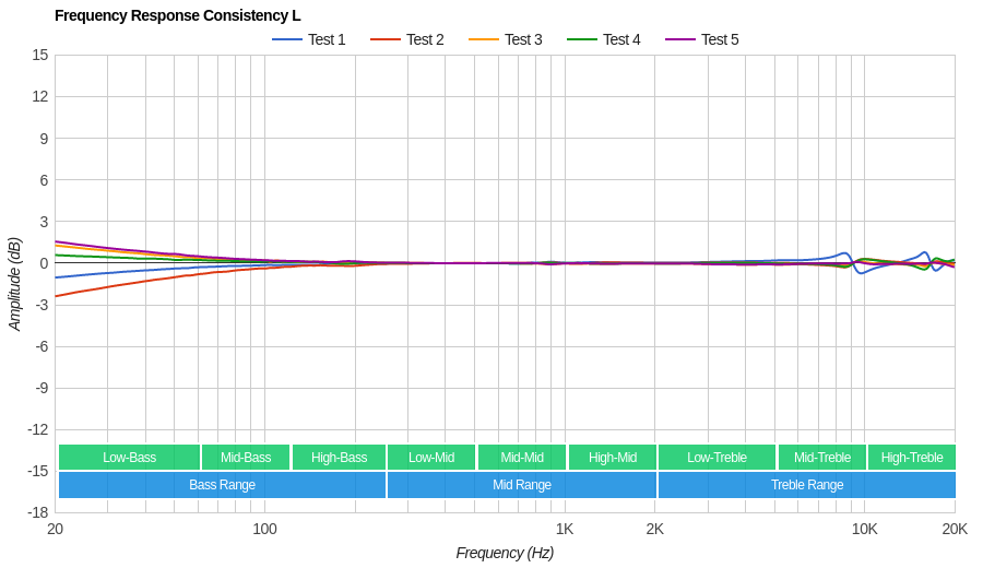 The frequency response consistency of the Fitbit Flyer is excellent. If the user is able to achieve a proper fit and an air-tight seal using the assortment of tips that come with the headphones, then they should be able to get consistent bass and treble delivery every time they use the headphones.