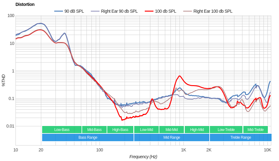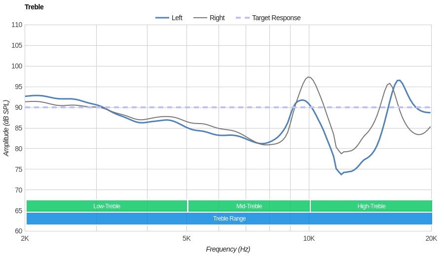 Average treble range performance. The asymmetrical dip between 3KHz and 9KHz, negatively affects the detail and presence of vocals and lead instruments. However, since the bigger part of the dip is around 9KHz, most of the negative effect will be perceived as a lack in sharpness (S and T sounds).