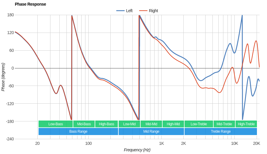 The imaging performance of the Flyer is about average. The weighted group delay is 1.37, which is quite high, and among the worst we have measured so far. The GD graph shows that the problem area is in the lower bass, especially around 40Hz, which corresponds to the 40Hz dip in the frequency response. This suggests that the bass of the Flyer won't be very fast and tight, which will negatively affect its punchiness. On the plus side, the L/R drivers of our test unit were decently matched, which helps with the accurate placement and localization of objects (voice, instruments, footsteps) in the stereo image. The phase mismatch in the treble range although audible, won't have a significant negative effect on localization.