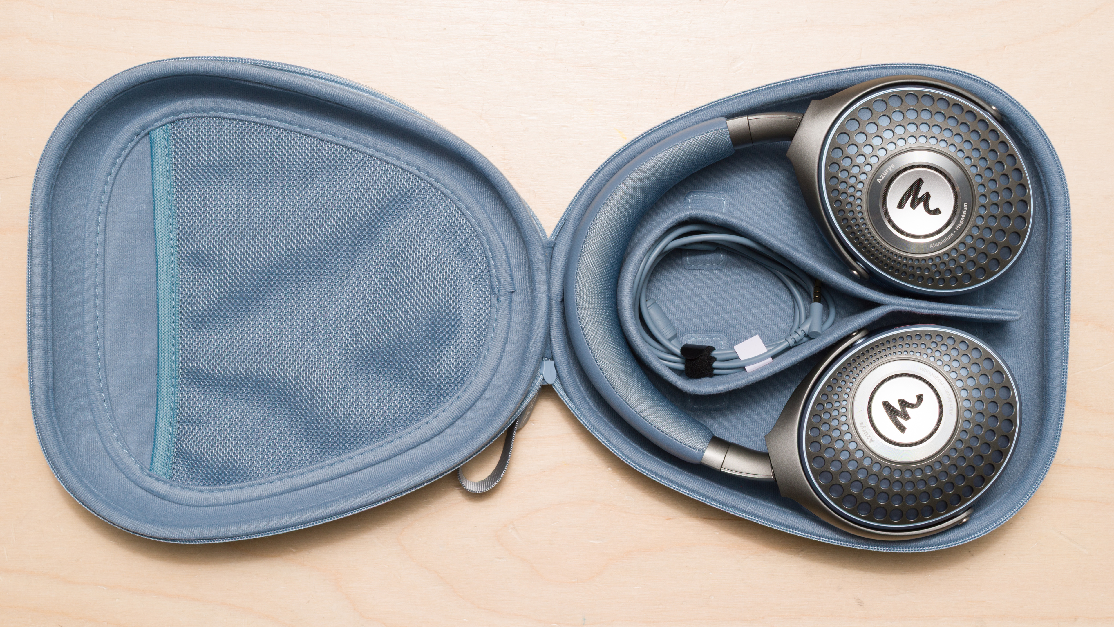 Their carrying case is great. It fully zips shut and is a hardshell design with a pale grey and blue variegated fabric exterior, which looks nice but might stain easily. The inside is molded to fit and protect the headphones, and it features a built-in pouch to keep the detachable cable safe.