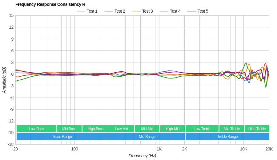 The frequency response consistency is great. The maximum amount of deviation across our five human subjects is about 3dB at 20Hz, but the rest of the bass range is exceptionally consistent. The treble delivery is also very consistent across multiple re-seat, with the maximum deviation below 10KHz being less than 3dB.
