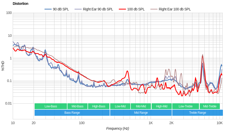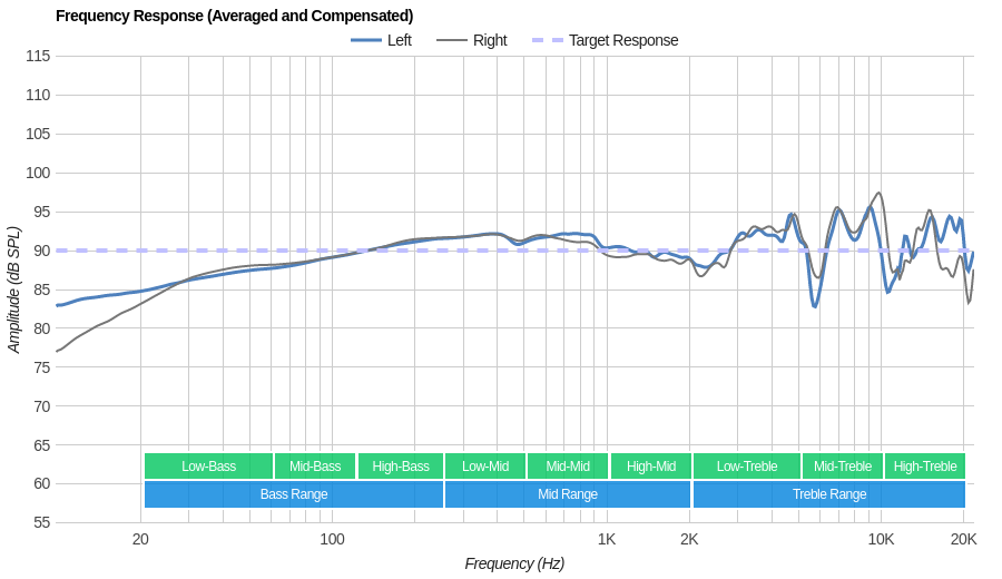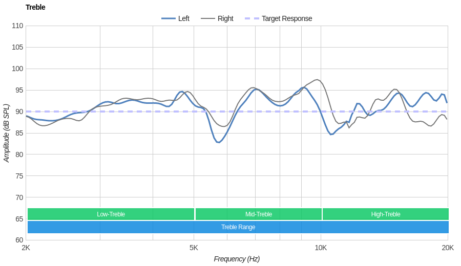 The mid-range is great. The response is even and flat throughout the range, suggesting a well-balanced reproduction of vocals and lead instruments. But low-mid and mid-mid are above our target by about 2dB. This thickens the body of vocals and lead instruments a bit, but won't be noticeable to most.