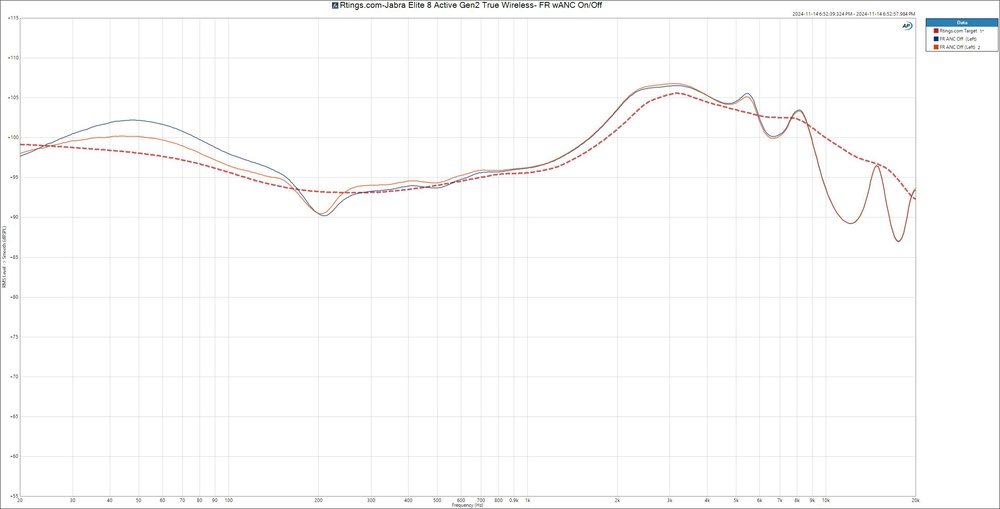 The Jabra Elite 8 Active Gen 2 have good peaks and dips performance, meaning they generally follow their own warm sound profile. A small dip in the high-bass thins out some of the warmth in bass guitar relative to the mid-bass punch. A series of peaks and dips in the treble can cause sibilants like S and T sounds to sound dull or bright depending on their pitch.