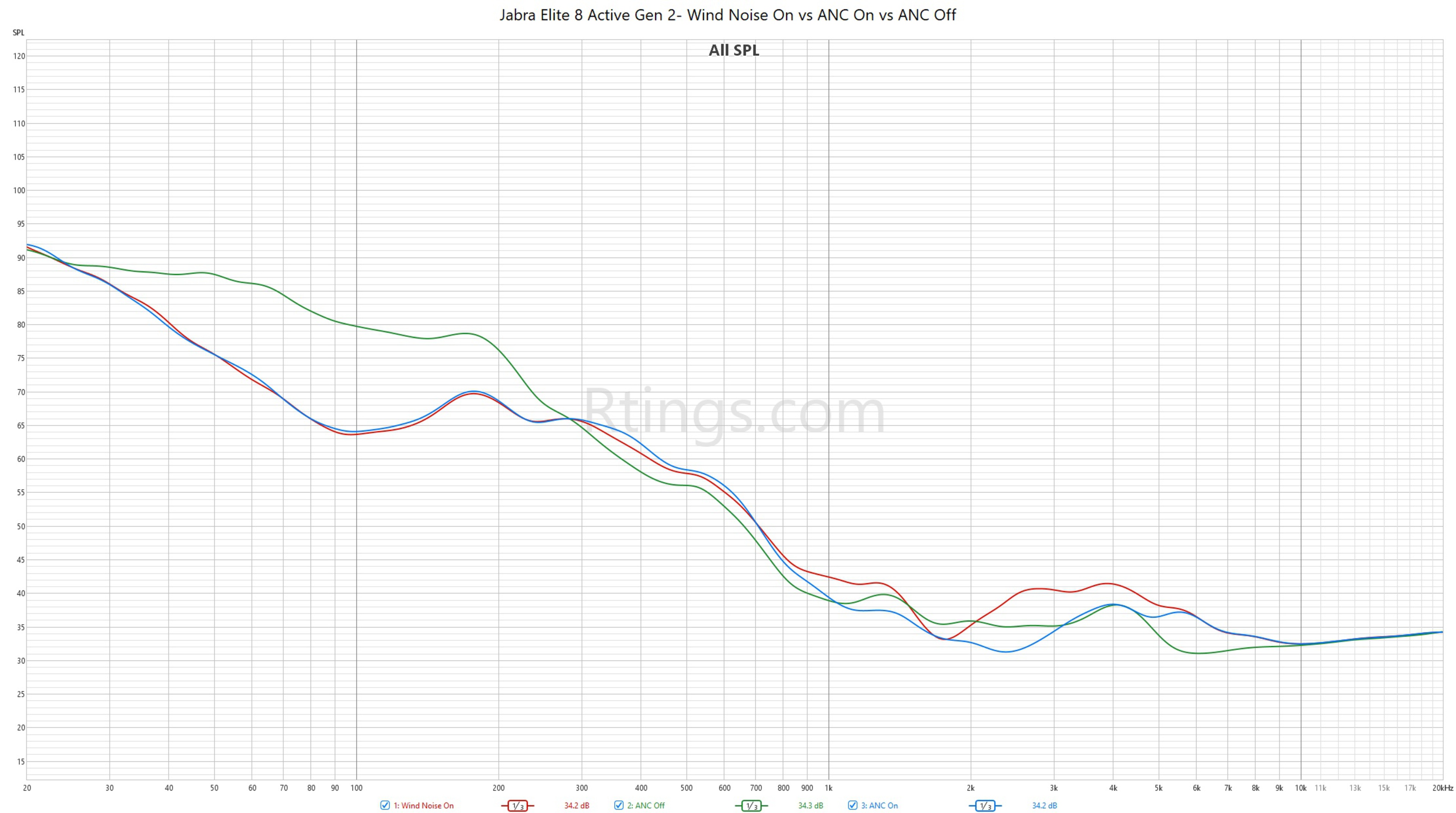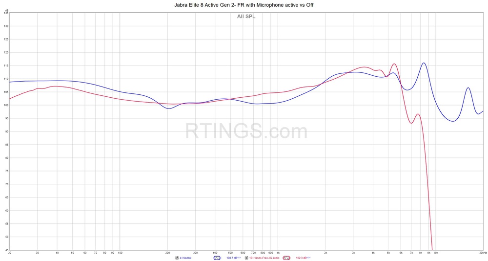 The Jabra Elite 8 Active Gen 2 True Wireless have a remarkable full-range noise isolation performance. Their ANC can effectively attenuate against external noise across the entire frequency range, blocking out both low rumbles and high-pitched squeals alike. These buds performed even better than the top-of-the-line Jabra Elite 10 Gen 2 Wireless, which could be attributed to their improved passive isolation seal on our B&K 5128 testing head. You can see the difference between the two tips.