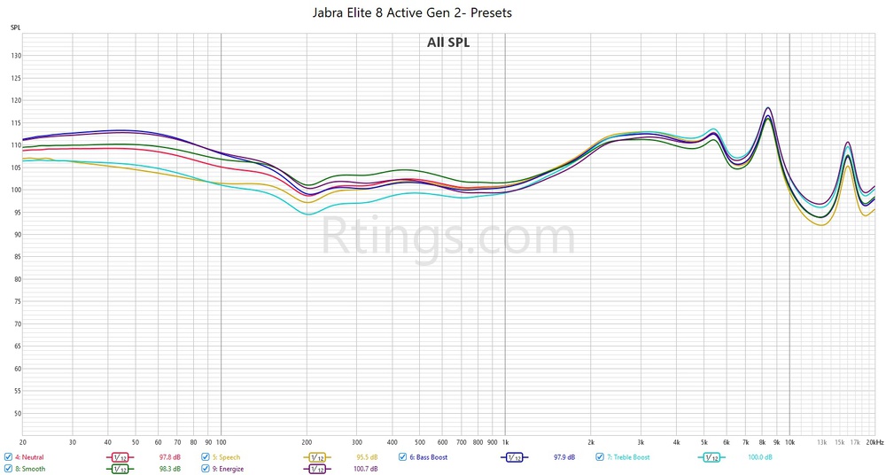 These are the settings used to test the Jabra Elite 8 Active Gen 2. We used the small silicone tips for all sound testing and the medium tips for isolation testing. Our results are only valid when using these settings.