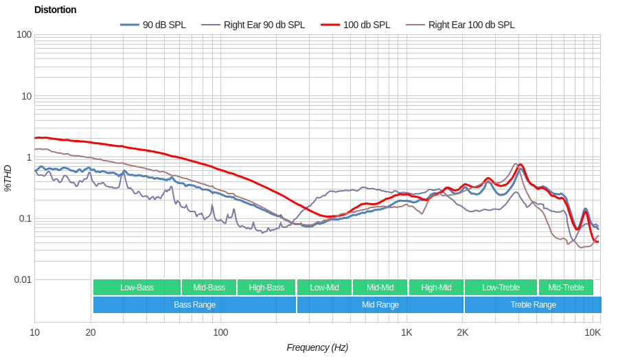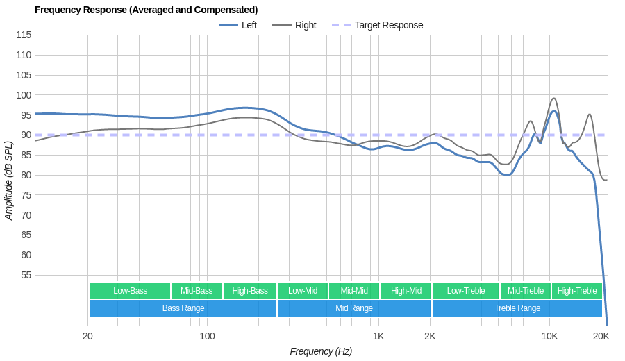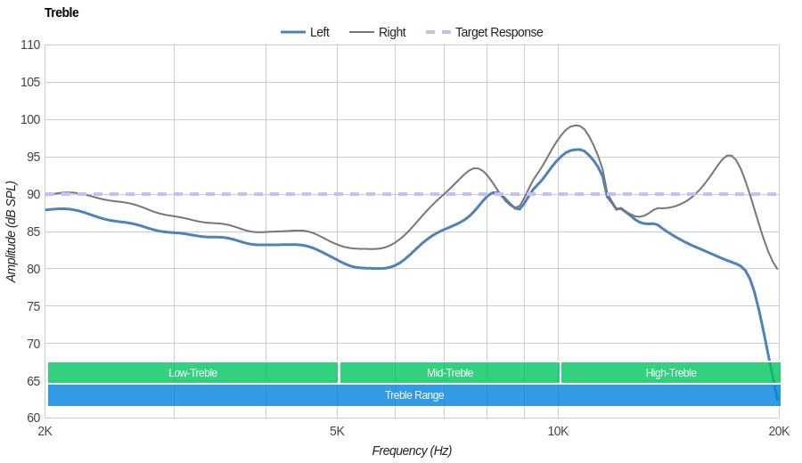 The treble performance is about average. Low-treble and mid-treble are under our neutral target by at least 3dB. This negatively affects the brightness and detail of vocals and lead instruments. The peak around 11KHz could make vocals and cymbals noticeably sibilant (sharp and piercing on S and Ts).