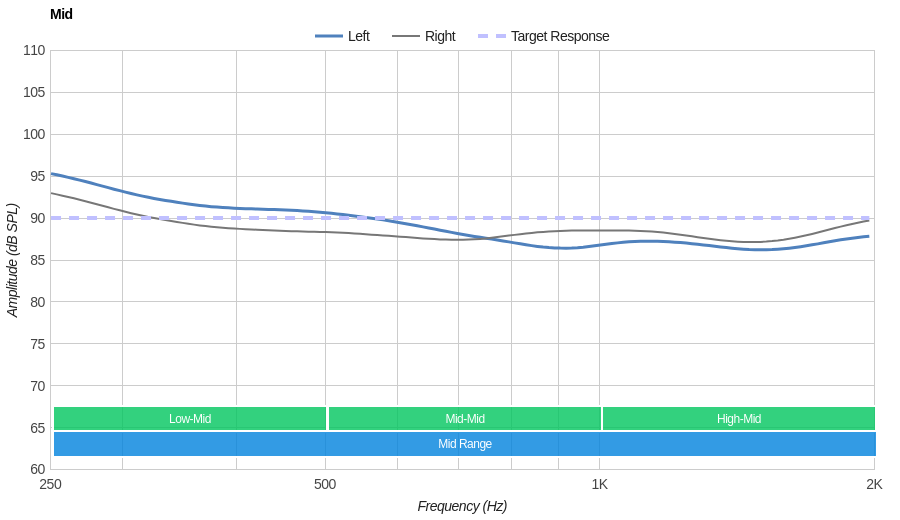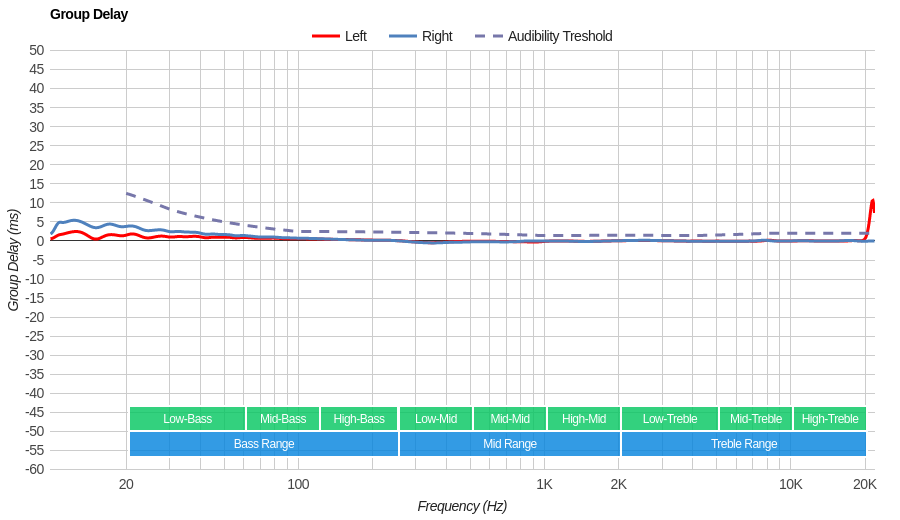 The imaging performance is average. The weighted group delay is at 0.13, which is very good. The GD graph also shows that the entire group delay response is below the audibility threshold. This ensures a tight bass and a transparent treble reproduction. Additionally, the L/R drivers of our test unit were very well-matched in phase response, which is important for creating a cohesive stereo field. However, our test unit showed a significant amount of mismatch in amplitude and frequency response. This skews the stereo image to one side and hurts the accuracy of the placement and localization of objects (instruments, voice, footsteps), in the stereo image.