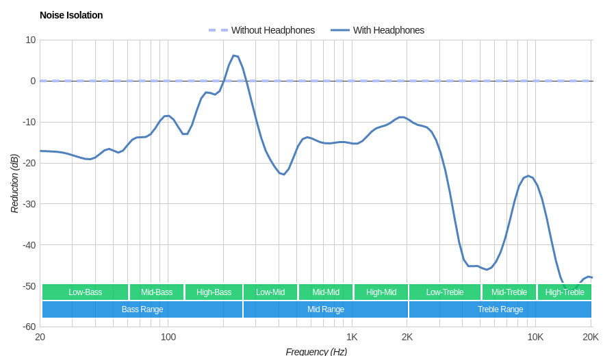 The isolation performance of the Jabra Elite Sport is decent. In the bass range, where the rumble of airplane and bus engines sits, they isolate by more than 11dB, which is decent. In the mid-range, important for blocking out speech, they reduce outside noise by 14dB, which is above-average. In the treble range, occupied by sharp sounds like S and Ts, they achieve more than 33dB of isolation, which is good.