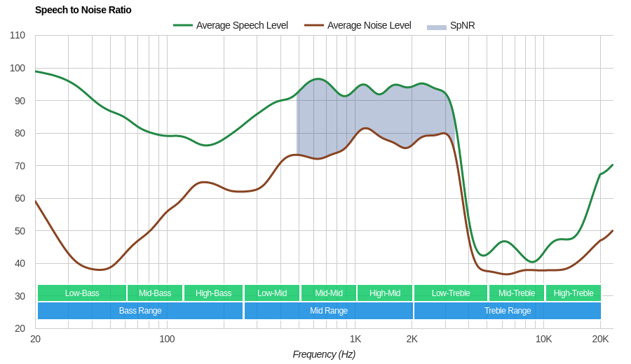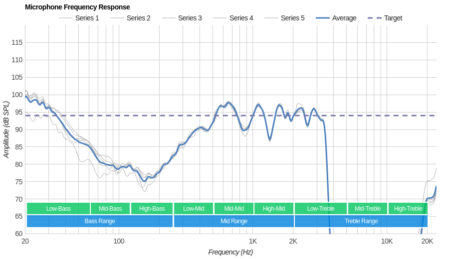 The recording quality of the microphone is sub-par. The LFE (low-frequency extension) of 486Hz indicates that speech recorded/transmitted with this mic will sound noticeably thin. The HFE (high-frequency extension) is at 3.4KHz, which results in a speech that is lacking in detail and noticeably muffled.