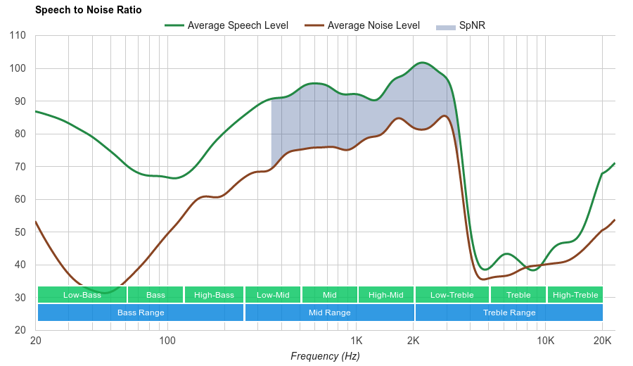 The microphone has a mediocre recording quality. The LFE (low-frequency extension) of 354Hz suggests that recorded/transmitted speech will sound a bit thin. The HFE (high-frequency extension) of 3.5KHz results in a speech that is relatively muffled and lacking in detail. The bump around 2KHz adds a little to the intensity and brightness of speech.