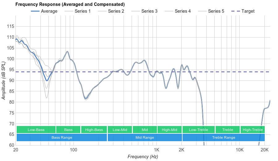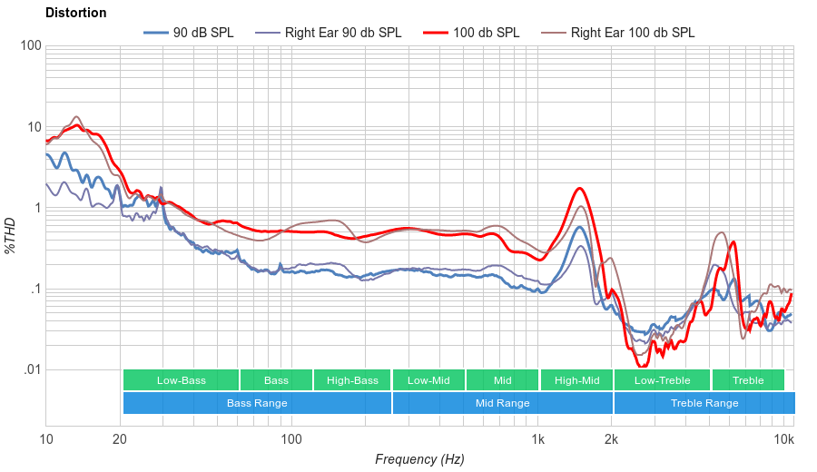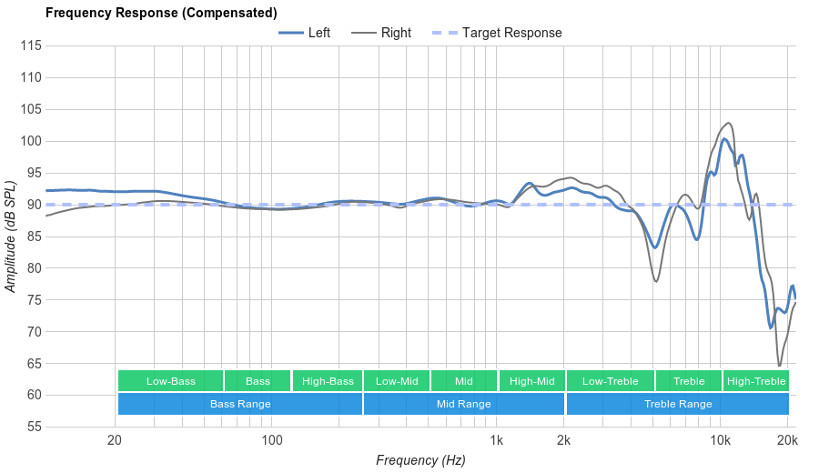 The JBL Everest 700 has an excellent bass. LFE (low-frequency extension) is at 10Hz, indicating a very deep bass. Additionally, low-bass, mid-bass, and high-bass are basically flat and within 1dB of our target response. This indicates a neutral and well-balanced bass, with enough thump and punch to handle bass-heavy genres like EDM, Hip-hop and film scores. The only remark is the slight mismatch between L/R drivers in low-bass, which won't be audible.