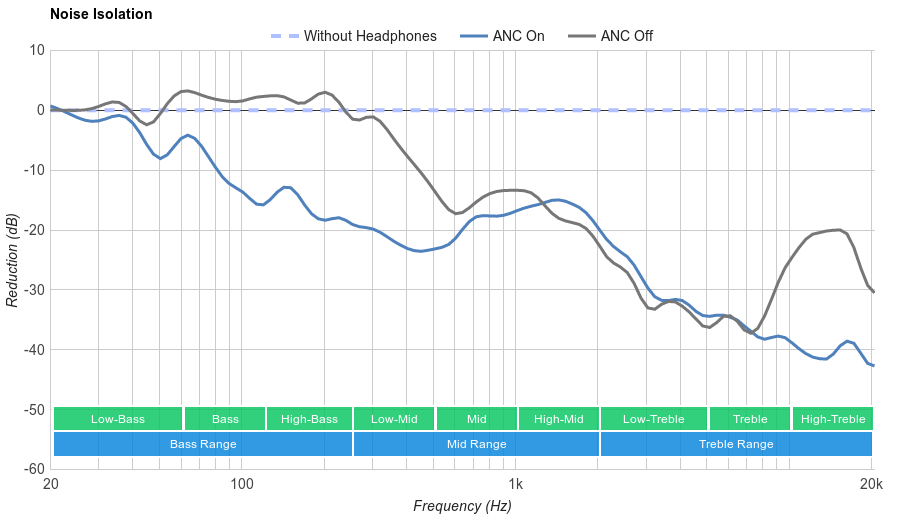 The JBL Everest 700 have a decent active noise cancellation. They provide about 9dB of isolation in the bass range, which is about average. The bass range is where the low sounds like the rumble of airplane and bus engines located. In the mid-range, important for cancelling out speech, they achieved 19dB of isolation, which is quite good. They also do well in the treble range, which is occupied by sharp sounds like S and Ts, and isolate by more than 34dB.