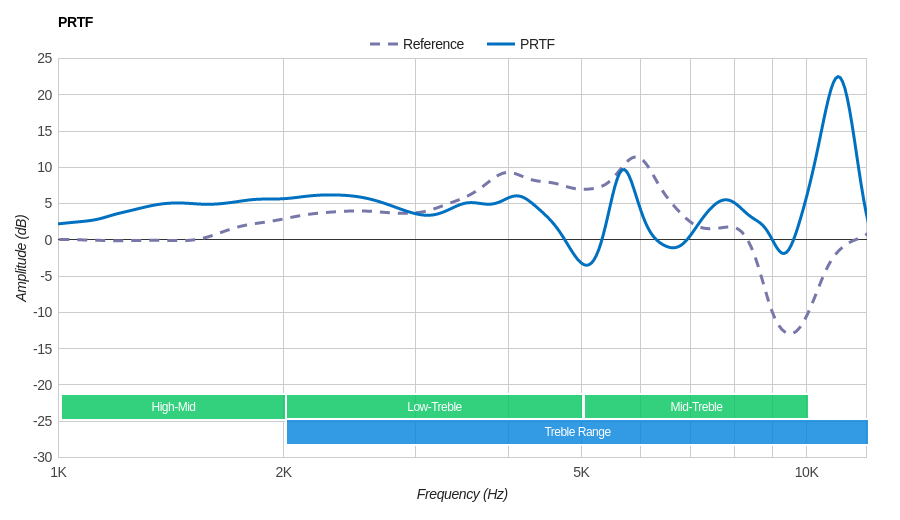 The mid-range of the JBL Everest 700 is great. Low-mid and Mid are within 0.5dB of our target, which is excellent. Ensuring a clear mix and well-balanced vocals and lead instruments. High-mid shows less than 2dB of overemphasis, which is going to make the sound of these headphones very slightly forward, especially on vocals/leads.