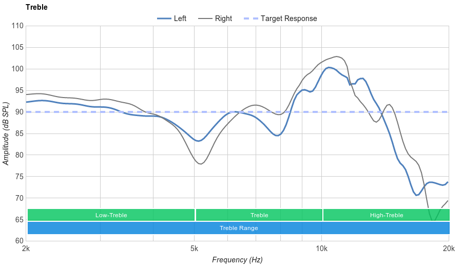 The treble is about average. Low-treble is hyped by about 2dB, which is the continuation of the high-mid overemphasis. This is going to add a bit of excess presence to the sound, which will be mostly noticeable on vocals/leads. The dip surrounding 5KHz won't be very audible due to its narrow width. However, it will have a negligible negative impact on detail and articulation. The 10dB bump centering around 10KHz makes these headphones noticeably sibilant, and could sound sharp and piercing to those with hyper sensitive ears on overly bright tracks. Unfortunately, their treble range sound s a lot sharper than the AKG N700NC which have also be tuned by Harman.