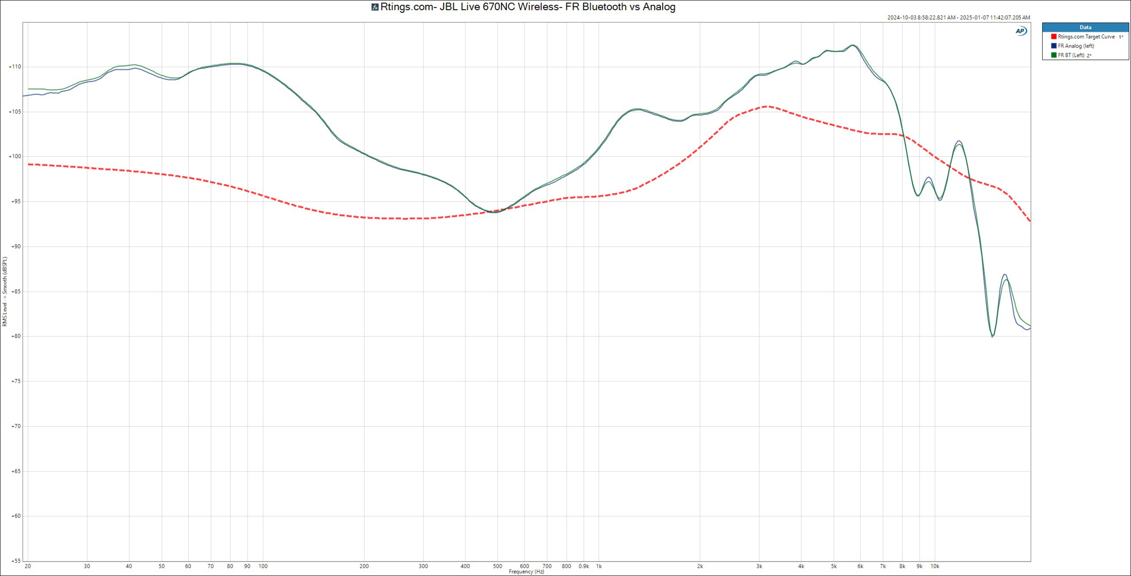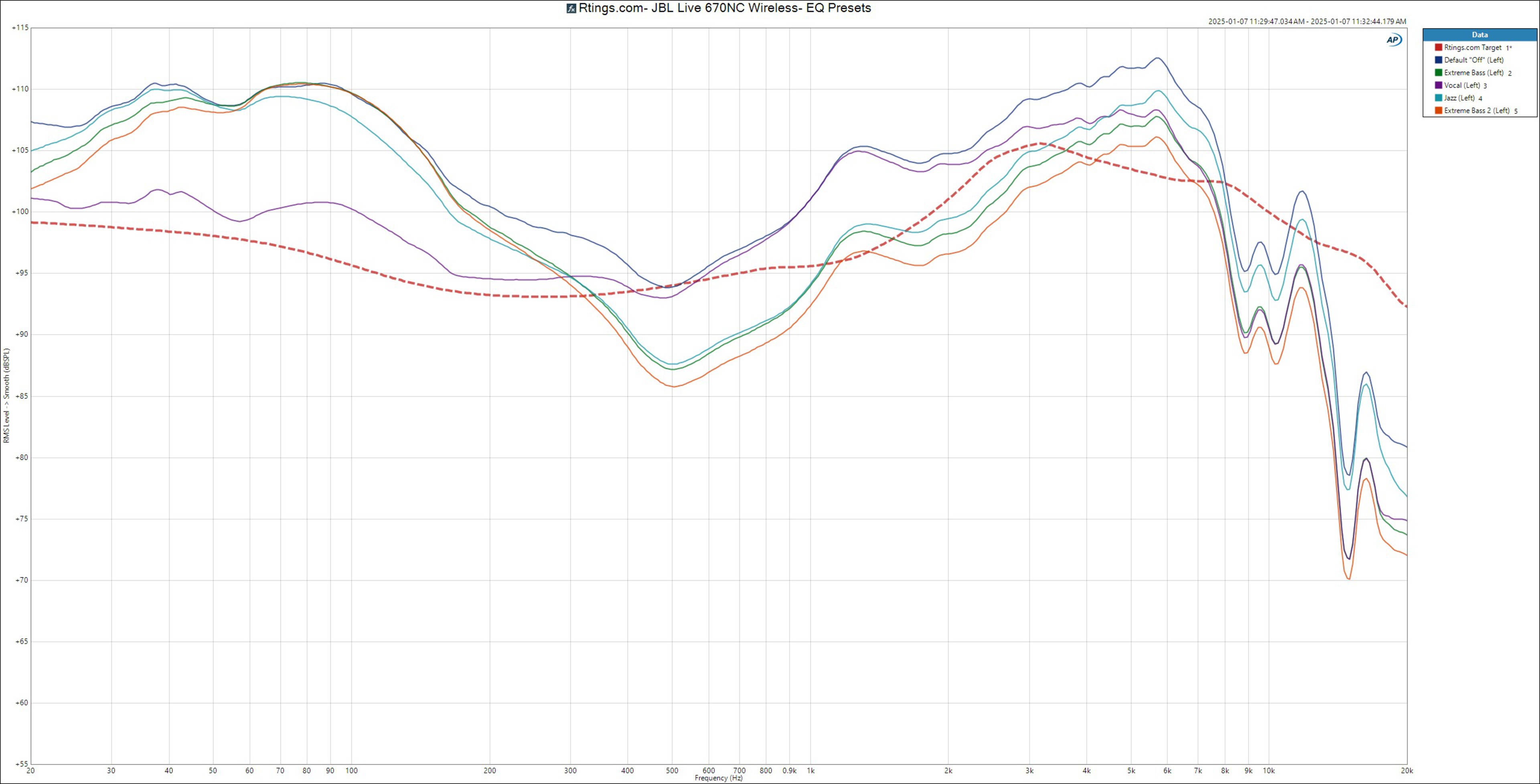 The JBL Live 670NC have an excited V-shaped sound profile with an almost overwhelming amount of bass. This staggering bass response can dominate the mix, detracting from the clarity and detail of the mids. The treble range is overemphasized across the entire range, resulting in sibilants, like hi-hats, sounding overly sharp and piercing to the ear. Fortunately, the companion app offers a parametric EQ and presets, so you can tame some of these more excessive frequencies. You can see how the presets affect the sound profile here.