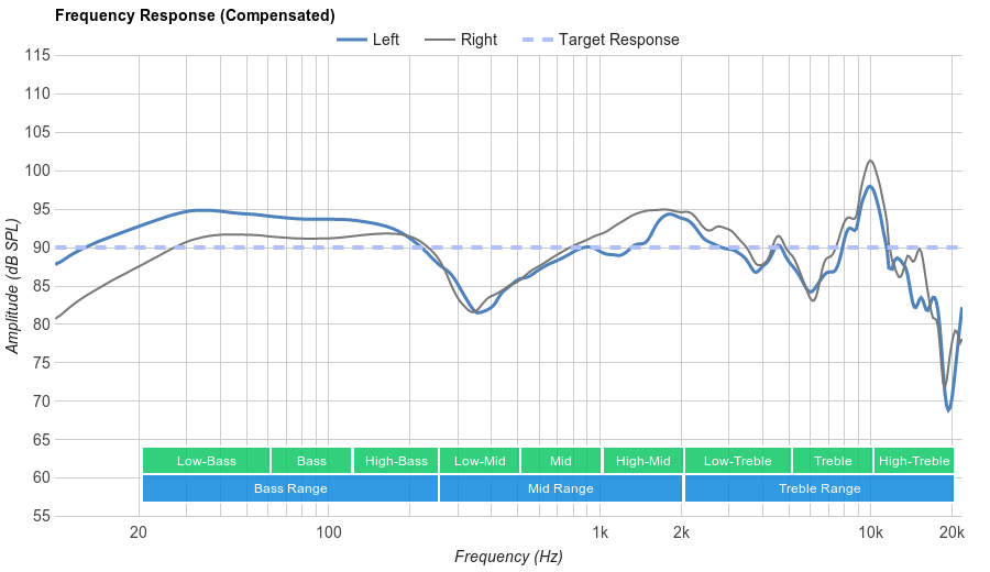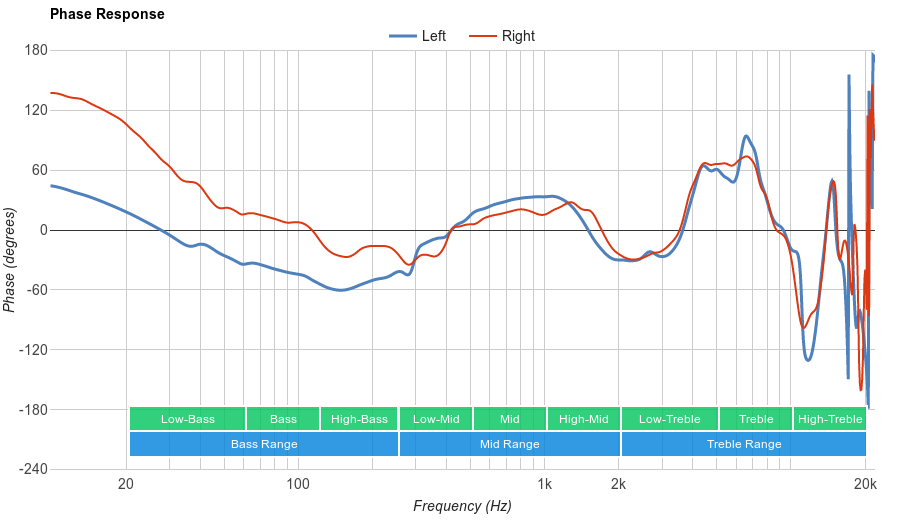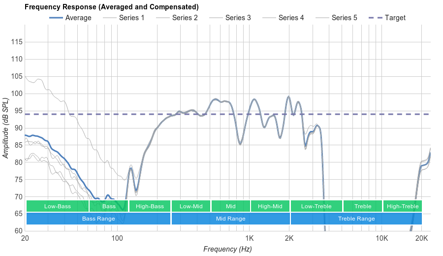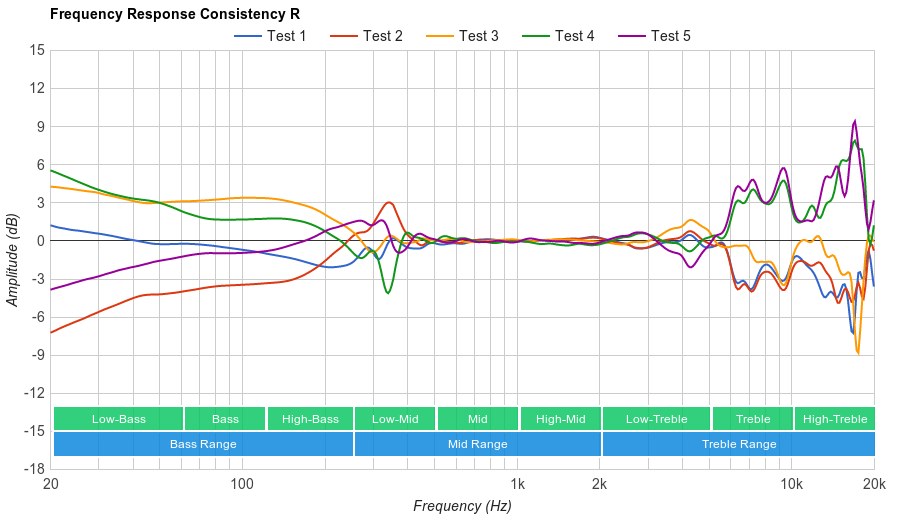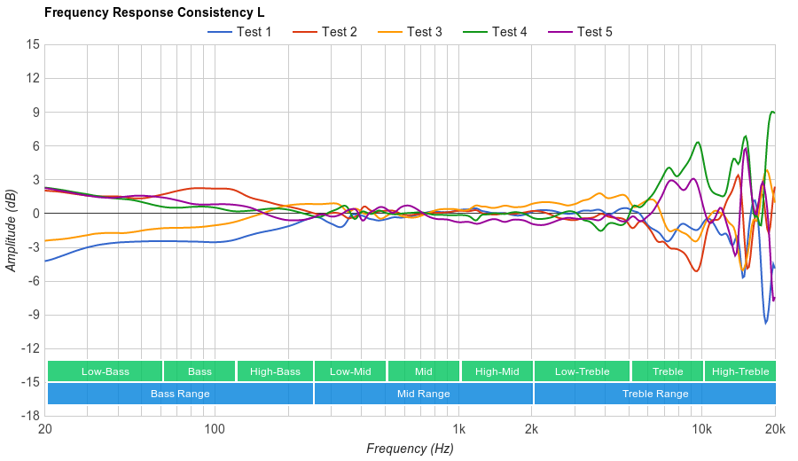 The frequency response consistency of the E50BT is sub-par. We measured more than 6dB of variance in bass across our 5 human subjects. The bass delivery is also sensitive to whether the user wears glasses. The treble delivery is also inconsistent and sensitive to positioning, but more consistent than the bass response.