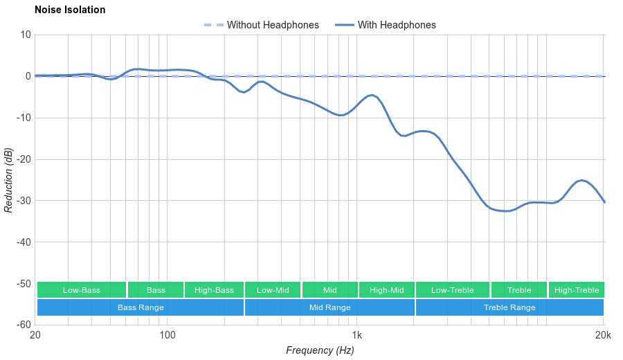 Poor isolation. Due to the passive isolation and poor fit, these headphones fail to achieve any isolation in the Bass Range. The amount of isolation achieved in the Mid and Treble Ranges are also sub-par.