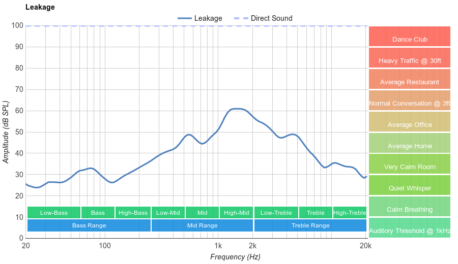 Poor Leakage. The large drivers and poor seal of these headphones cause them to leak a lot. The majority of the leakage is between 800Hz and 5Khz, with a sharp peak in loudness at 1.5KHz.