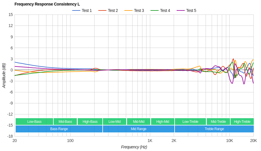 The Koss Porta Pro Wireless has a great frequency response consistency. In the bass range, the maximum amount of deviation across our five human subjects is about 3dB at 20Hz, but the rest of the bass range is quite consistent. The treble delivery is also very consistent across multiple re-seats, with the maximum deviation below 10KHz being less than 3dB.