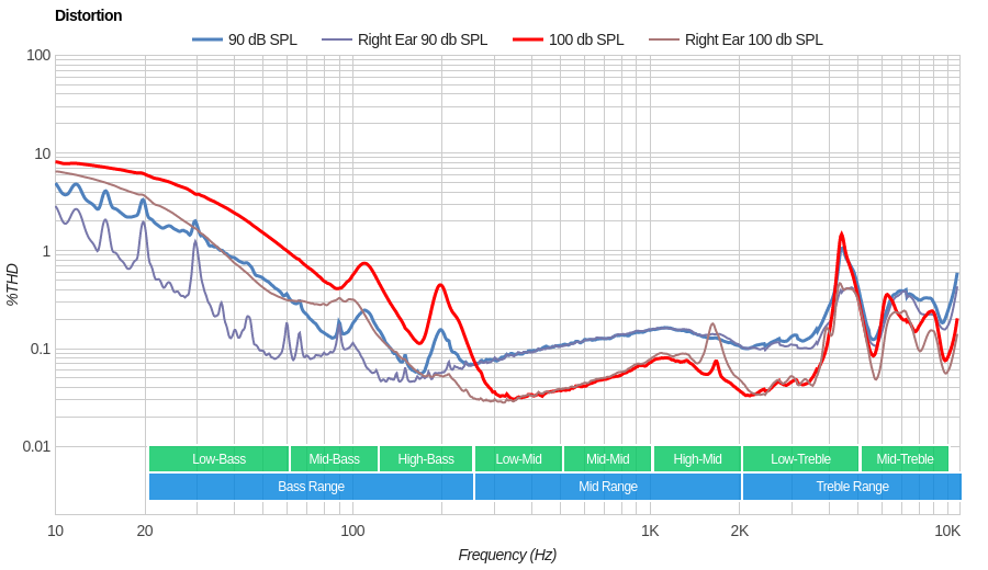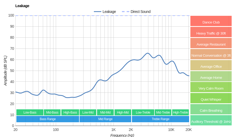 The leakage performance is sub-par. The significant portion of the leakage is between 1KHz and 12KHz, which is broad but mostly concentrated in the treble range. The overall level of the leakage is relatively loud too. With the music at 100dB SPL, the leakage at 1 foot away will average at 46dB SPL, and peaks at 65dB SPL, which is quite a bit above the noise floor of an average office.