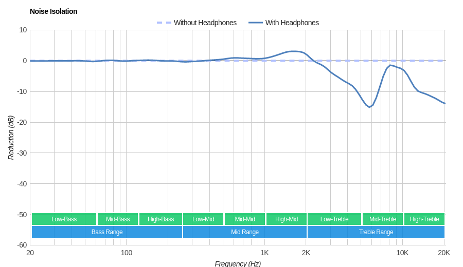 The Koss Porta Pro Wireless have a poor isolation, which is due to their open-back design. In the bass range, where the rumble of airplane and bus engines sit, they achieve no isolation. They also don't isolate in the mid-range, which is important for blocking out speech. In the treble range, occupied by sharp sounds like S and Ts, they achieved about 7dB of isolation, which is sub-par.