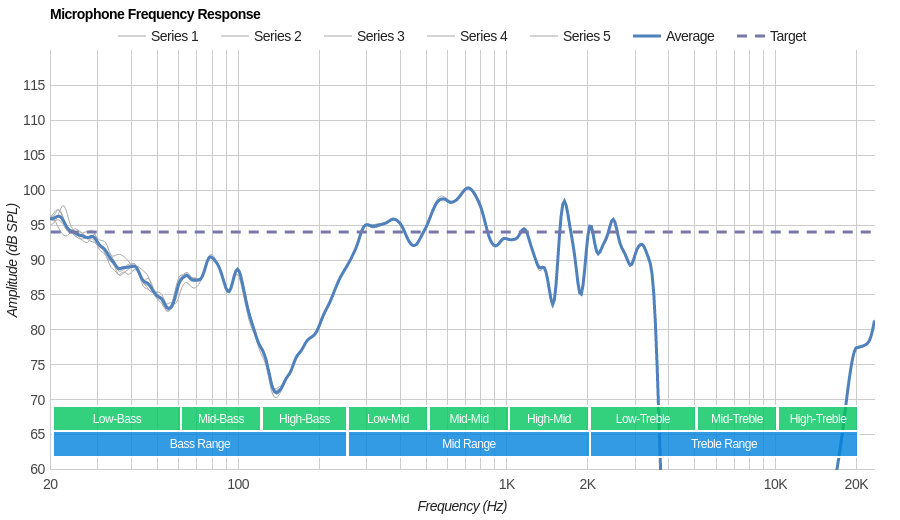 The microphone has an average recording quality. The big dip around 120Hz results in a recorded/transmitted speech that sounds relatively thin. The HFE (high-frequency extension) of 3.3KHz means that speech will sound muffled and lacking in detail. But it'll still be decently understandable, since speech intelligibility is mostly dependent on the 500Hz-4KHz range.