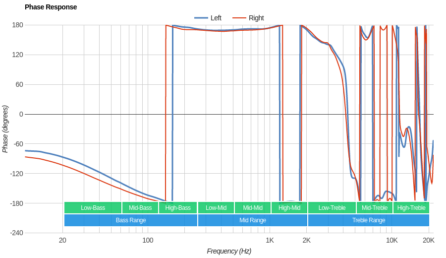 The imaging is great. Weighted group delay is at 0.22, which is within very good limits. The GD graph also shows that the entire group delay response is below the audibility threshold. This ensure a tight bass and a transparent treble reproduction. Additionally, the L/R drivers of our test unit were very well-matched. This is important for the accurate localization and placement of objects (voices, instruments, video game effects) in the stereo image.