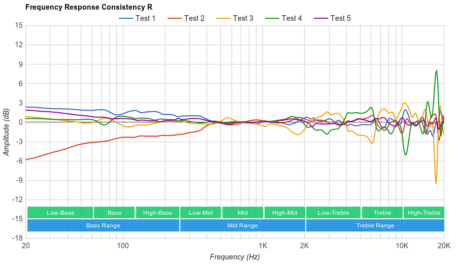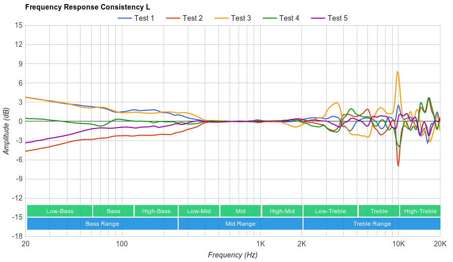 The Logitech G430 has a mediocre frequency response consistency performance. These headphones are prone to consistency issues throughout the range, especially in the bass range. The maximum variance measured across our five human subjects was about 9dB at 20Hz, which is noticeable. We also noticed that certain types of glasses could break the seal on these headphones and cause a drop in bass. In the treble range, the maximum amount of deviation below 10KHz, is about 6dB, indicating that these headphones' treble delivery is rather sensitive to positioning.