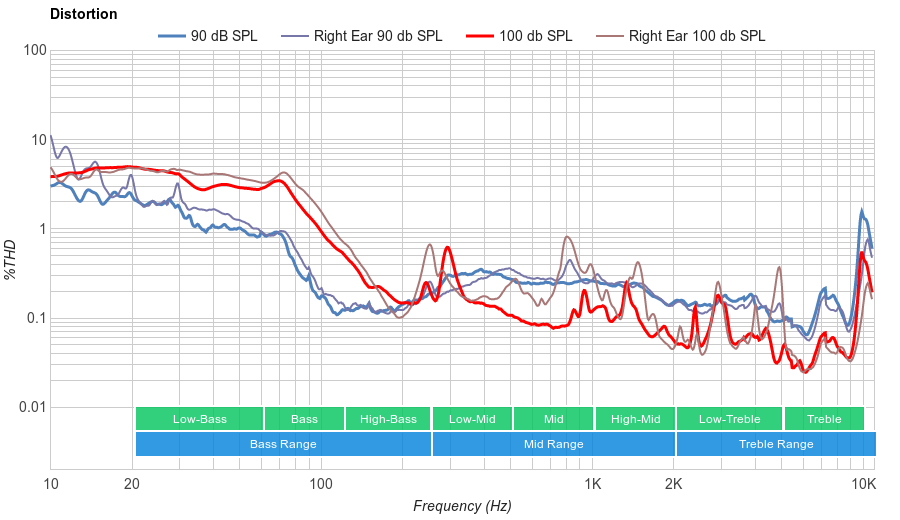 The bass is very good. Their LFE (low-frequency extension) is at 22Hz, which is great and more than what most speakers are able to reach. Accordingly, low-bass is over our neutral reference by about 2dB. Mid-bass and high-bass are also overemphasized, but by more than 3dB. Overall, the bass is thumpy, punchy, and well-balanced, but bit hyped and north of neutral which fans of bass will appreciate. Also, their bass delivery varies noticeably across users, and is sensitive to the quality of fit, seal, and whether you wear glasses. The response here represents the average bass response and your experience may vary.