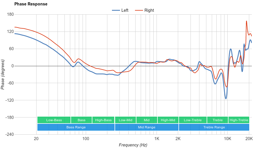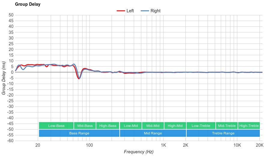 The imaging is very good. Their weighted group delay is at 0.4, which is good. The GD graph shows that the response doesn't cross our audibility threshold, except for the area around 70Hz. This means that they have a transparent treble, but their bass may lack a bit of punch in kick drums, but not enough to be significant. Additionally, the L/R drivers of our test unit were well-match, which is important for the accurate placement and localization of objects (instruments, voices, footsteps) in the stereo image.