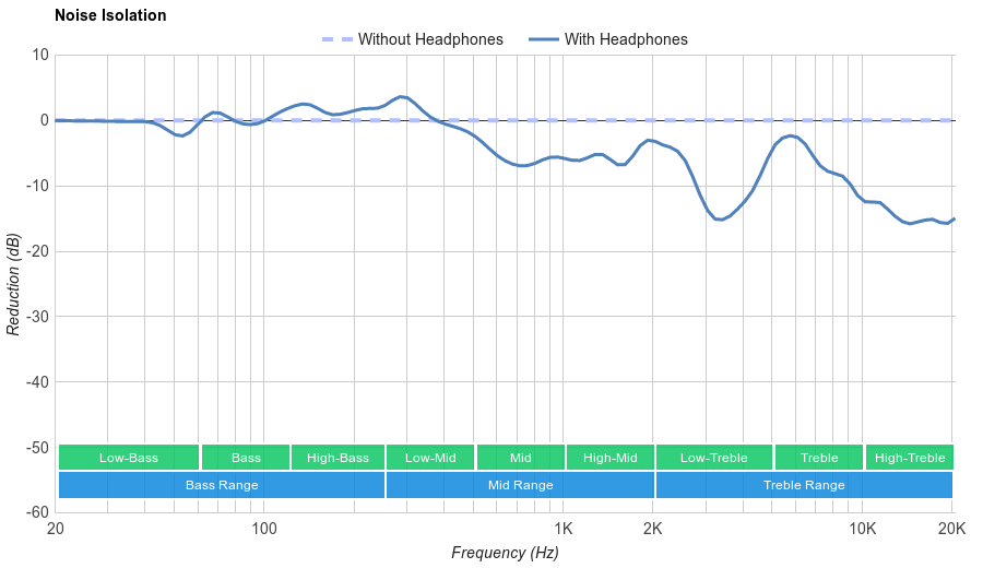 The isolation is poor. Although their enclosure design is closed-back, their breathable pads make them perform more like an open headphone. Therefore, they do not achieve any isolation in the bass range, important for cutting out the rumble of airplane and bus engines. In the mid-range, occupied mostly by speech, they reduce outside noise by about 4dB, which is barely noticeable. In the treble range, occupied by sharp S and T sounds, they achieved 10dB of isolation, which is also poor.