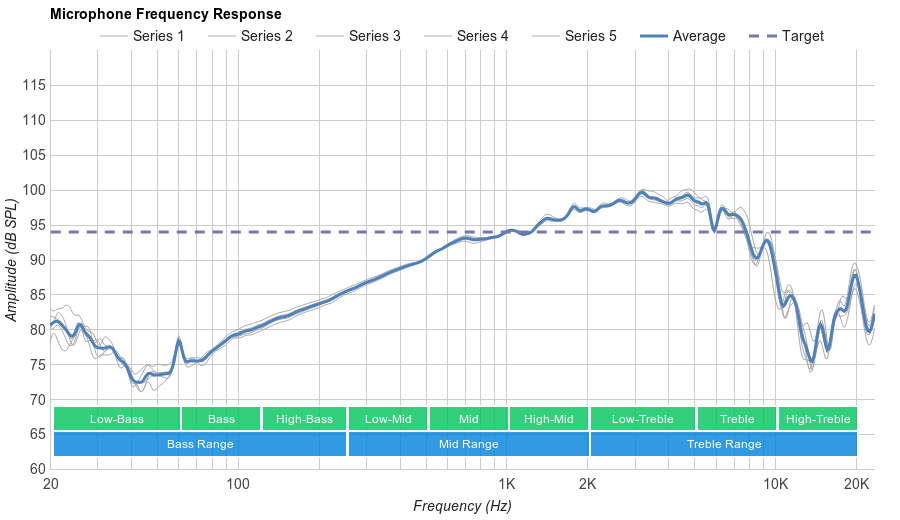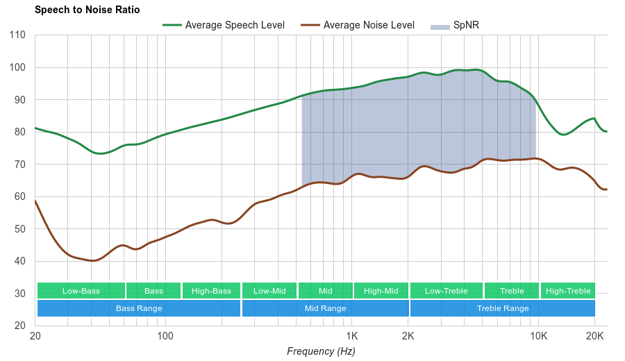 The microphone has a decent recording quality. The LFE (low-frequency extension) of 538Hz means that speech recorded/transmitted with this headset won't have any bass, and will sound quite thin. However, due to the decent frequency response and good high-frequency extension (HFE) of 9.7KHz, speech will have quite a bit of presence and detail, meaning it will be quite intelligible.