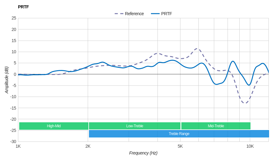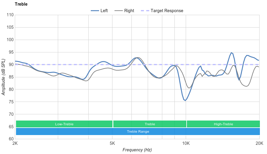 The treble is good. The response is rather uneven, but still relatively balanced, being underemphasized by only 2.5dB. The results in a treble that is a tad low on brightness and detail, especially on S and T sounds.