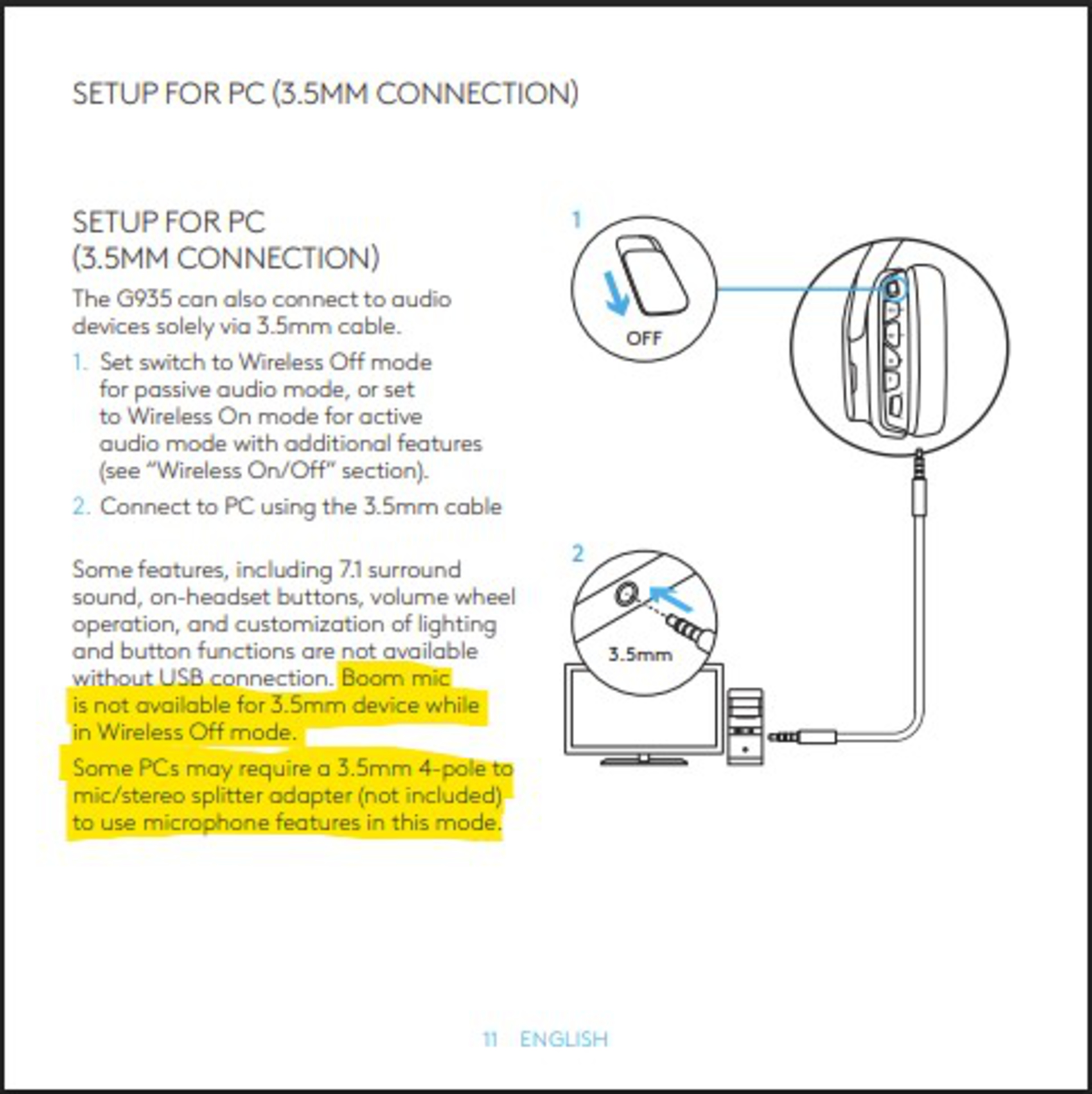 The Logitech G935 offer fewer connection options than the previous Logitech G933 Wireless. They don’t come with a TRRS to RCA cable and the dongle doesn’t have any inputs. The G935 can only be used wirelessly via their USB dongle on PC and PS4 for full audio and microphone support, and only support audio on Xbox One.