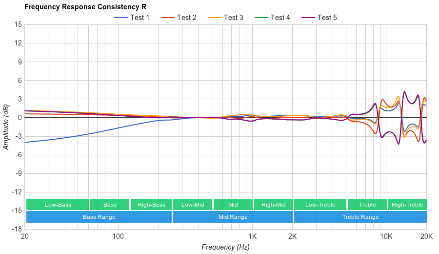 Very good frequency response consistency. Like other in-ear headphones, if the user can achieve a proper fit, then they should be able to get consistent results each time.