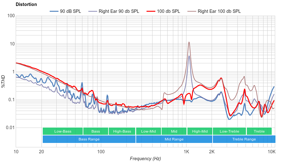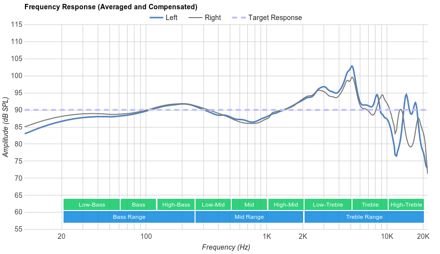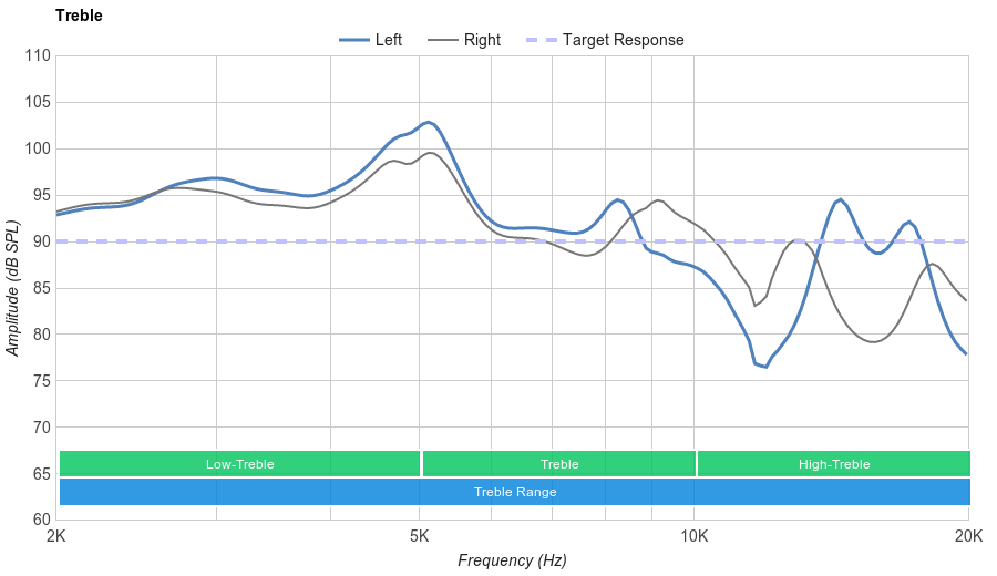 Mediocre treble range performance. Low-treble is overemphasized by more than 5dB, bringing excess brightness to vocals and lead instruments. The 10dB peak at 5kHz could make the treble to sound harsh on certain tracks.