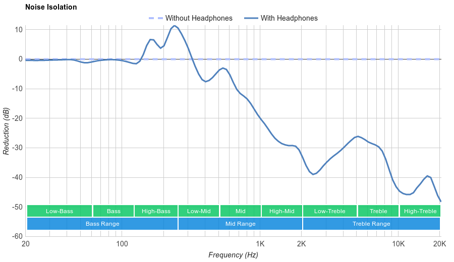 Average isolation. They don't isolate a lot of bass-range noises, and they even show some resonance buildup around 200Hz. In the mid-range, they achieve about 13dB of isolation which is above-average. In the treble range, they reduce ambient noise by more than 36dB, which is good.