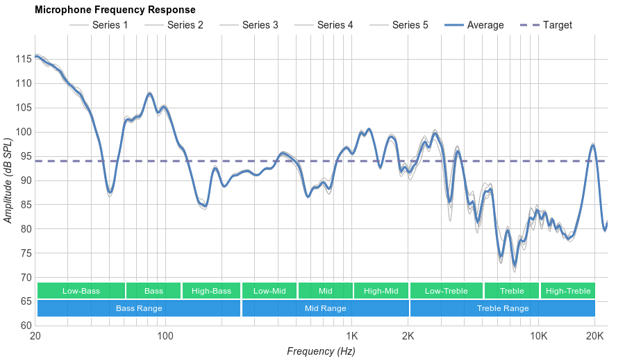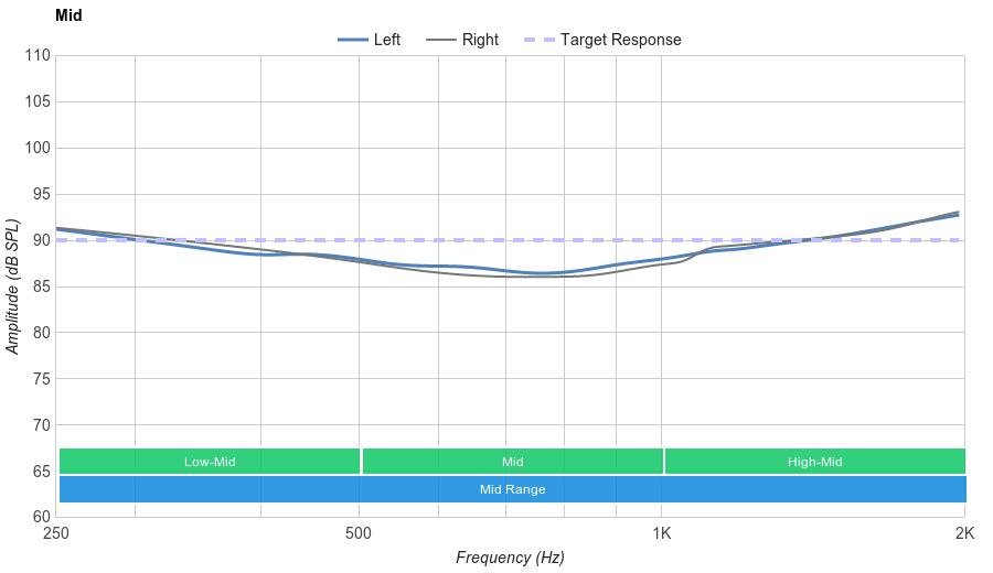 Very good mid-range performance. The overall response is pretty consistent, but the 4dB dip centered around 700Hz pushes vocals/leads slightly to the back of the mix.
