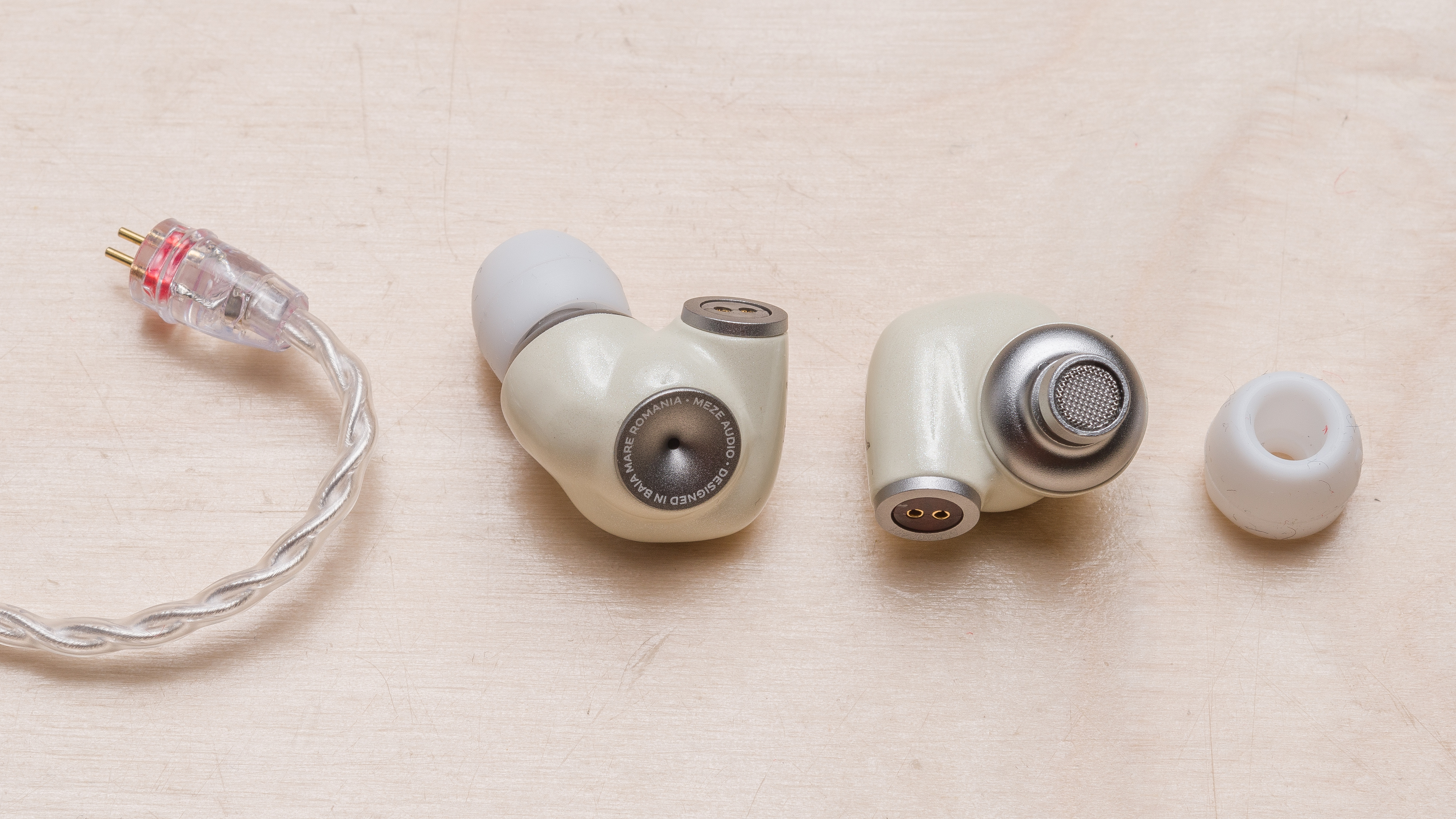 They have an understated, stylish design. Unlike the more angular TRUTHEAR HEXA, the Meze have nearly no straight edges in their design. Their shape more closely resembles the Sennheiser IE 200, though their finish is notably more premium; their body is composed of zinc and aluminum, which features silver highlights and an off-white pearlescent coating. To top off their aesthetic, the earbuds feature Meze's silver logo near their 2-pin connections, and the text "MEZE AUDIO DESIGNED IN BAIA MARE ROMANIA" is printed around the exhaust ports.