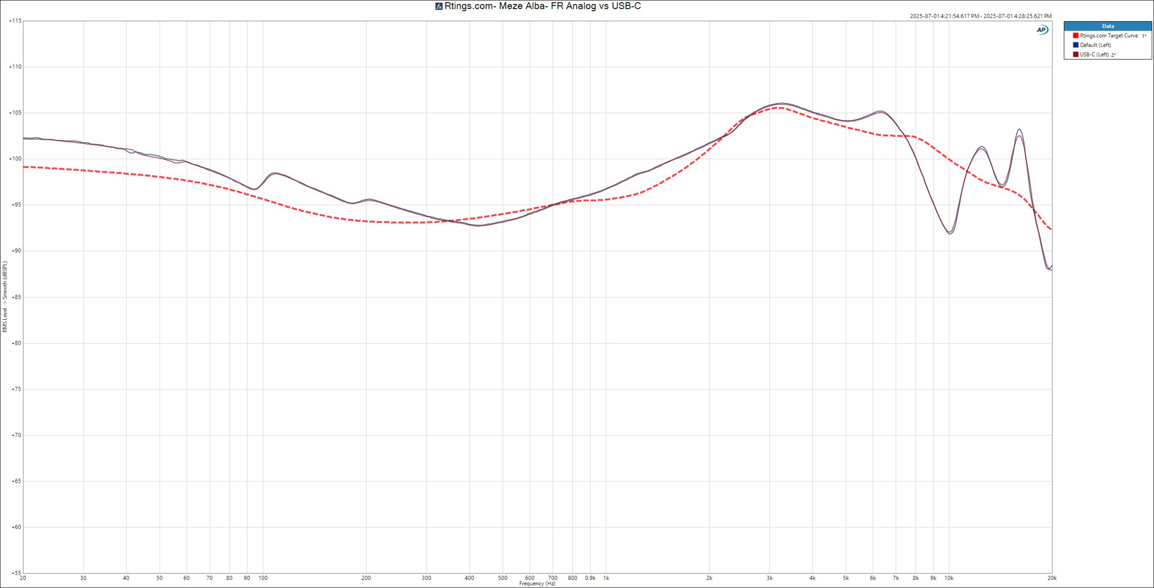 These are the settings used to test the Meze ALBA. Our results are only valid when the earbuds are used in this configuration. We used the analog connection for all our measurements after confirming the earbuds' frequency response was nearly identical when using the analog to USB-C adapter.