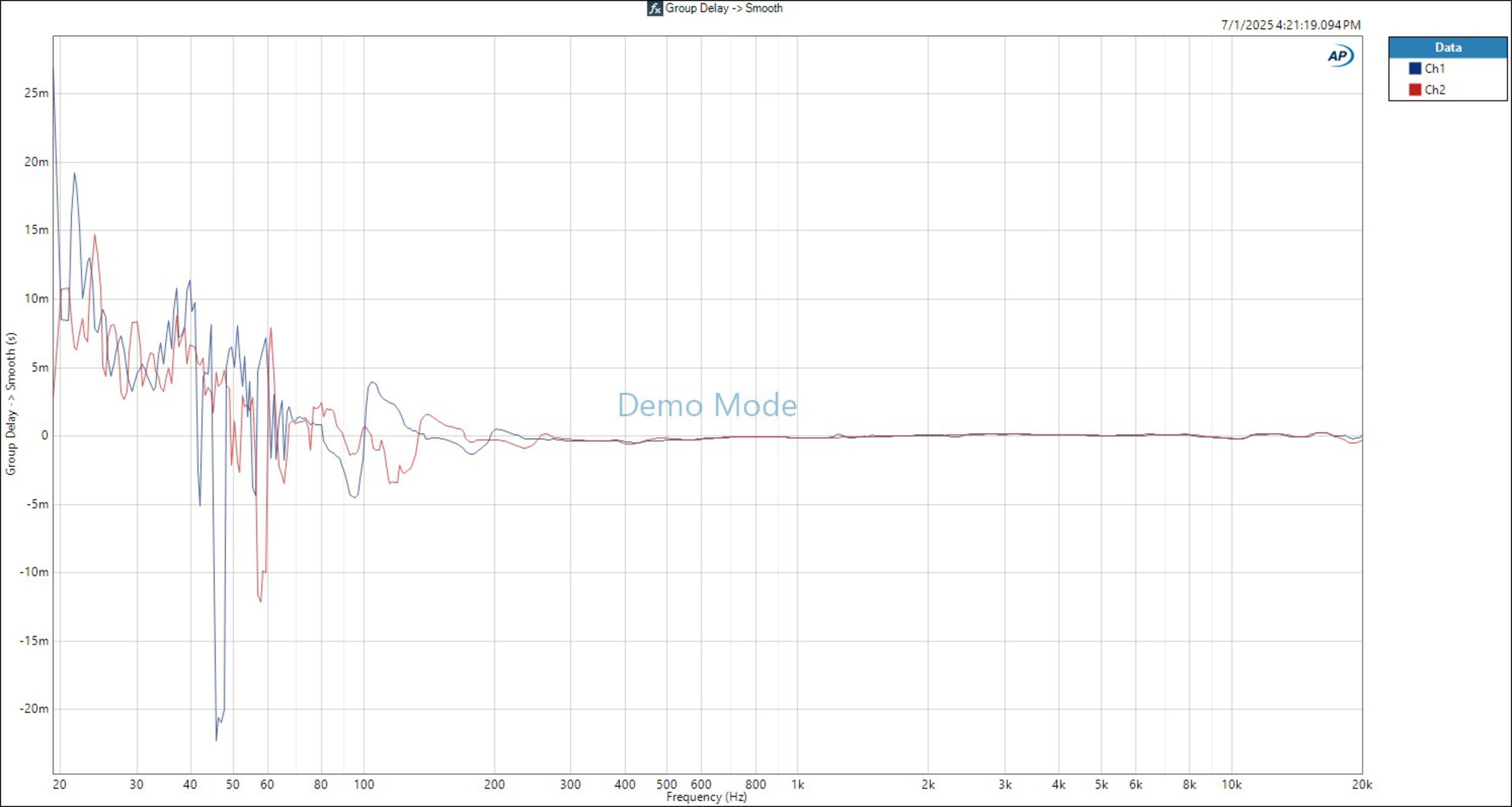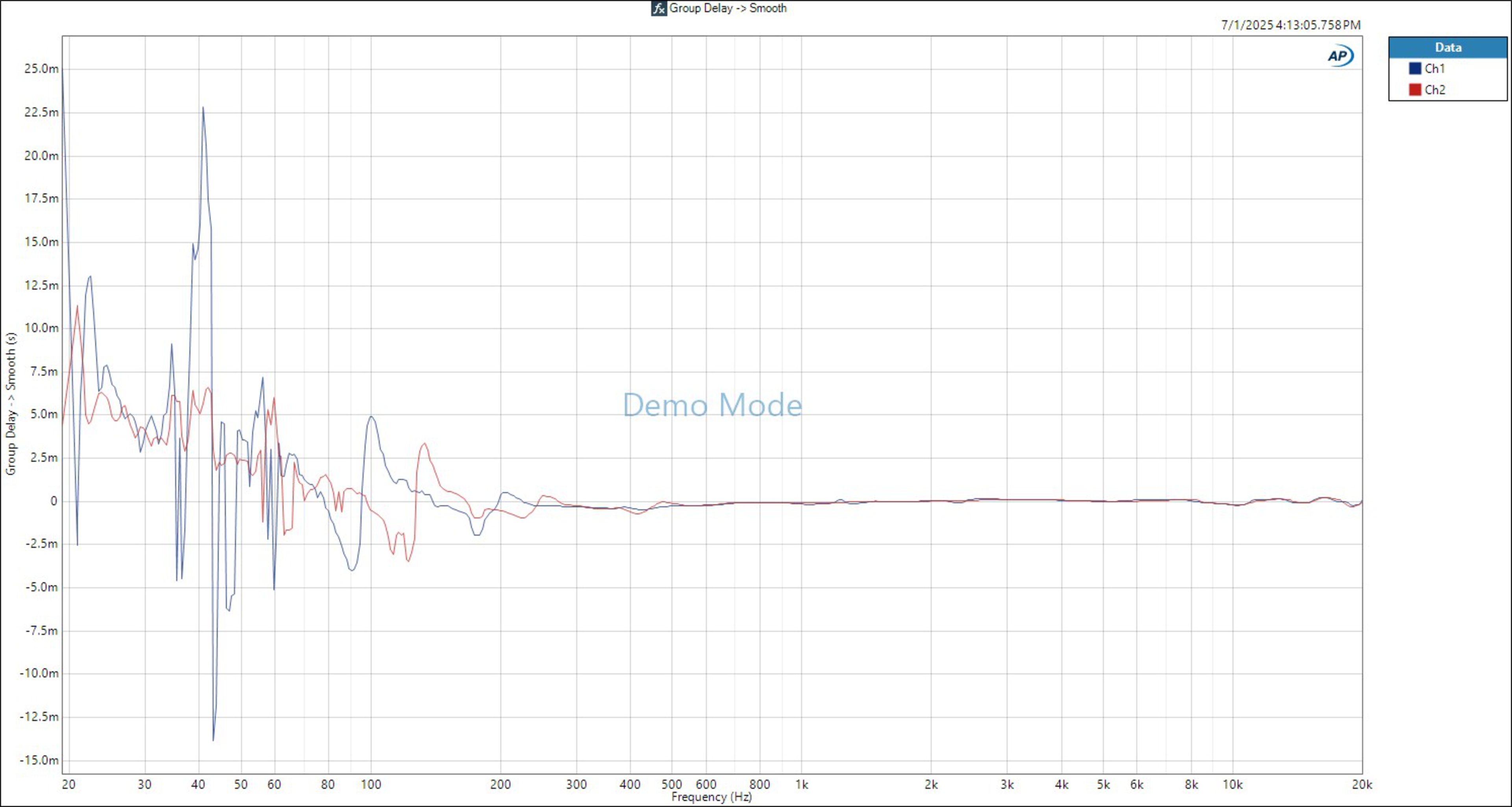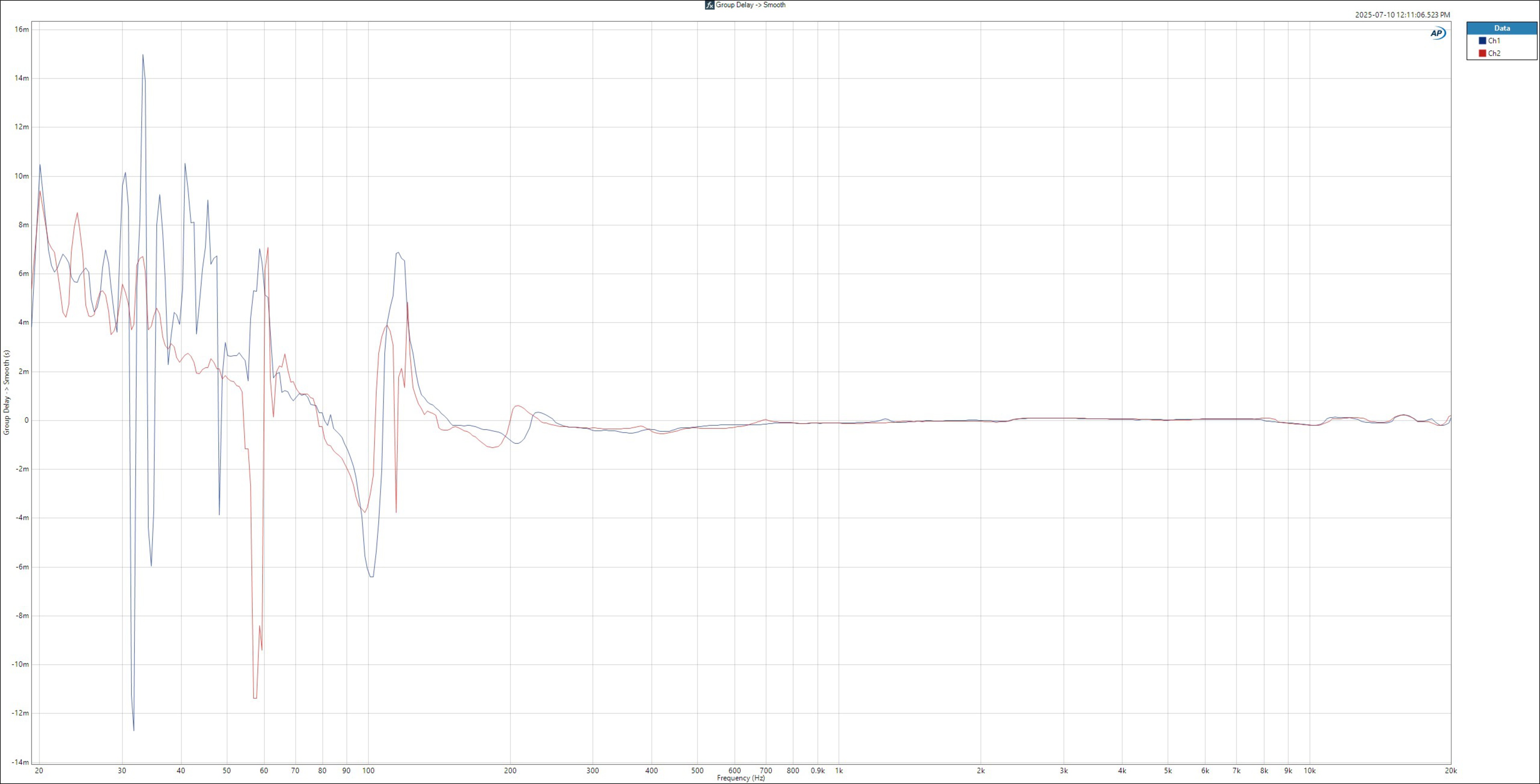 We measure group delay over three passes (1, 2, and 3), and it produced varied results in the low bass. This was likely caused by interactions of the silicone ear tips and our test rig's silicone ears.