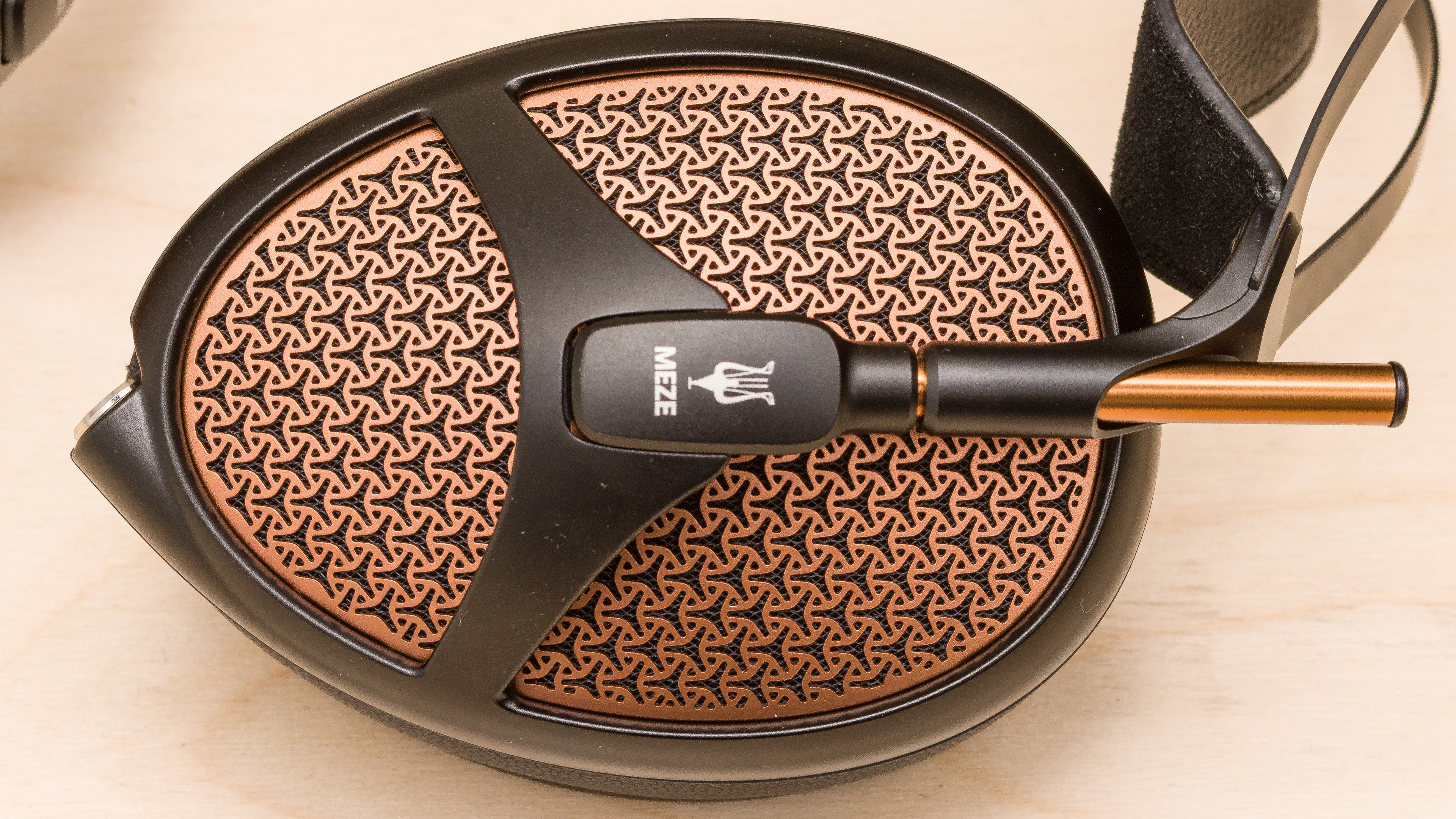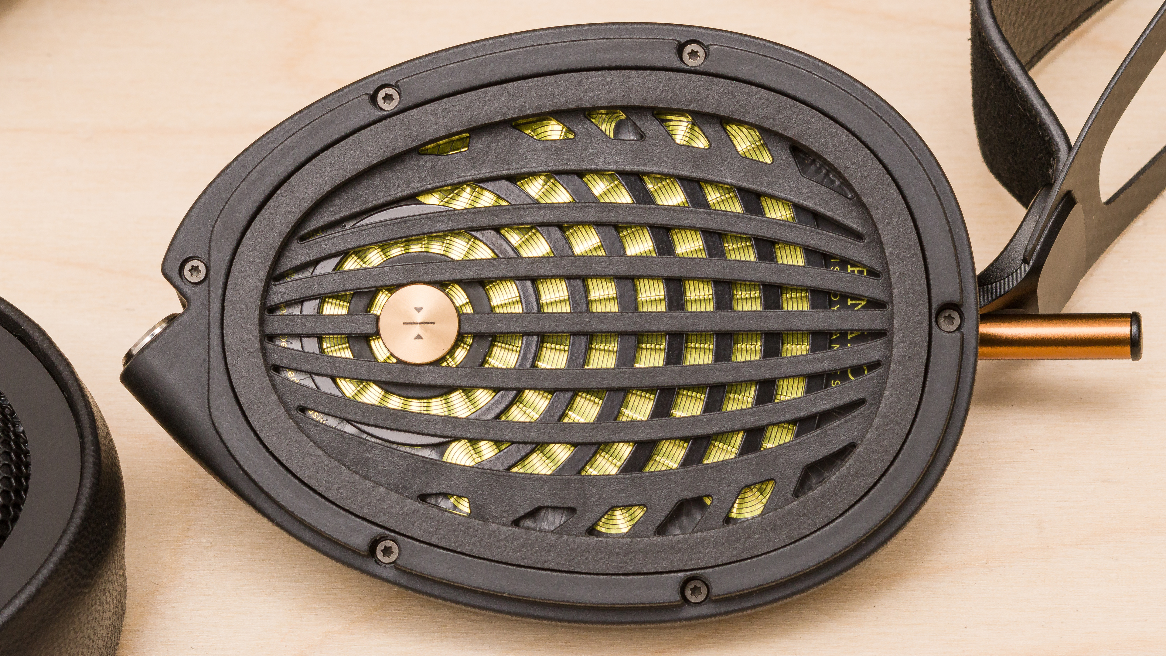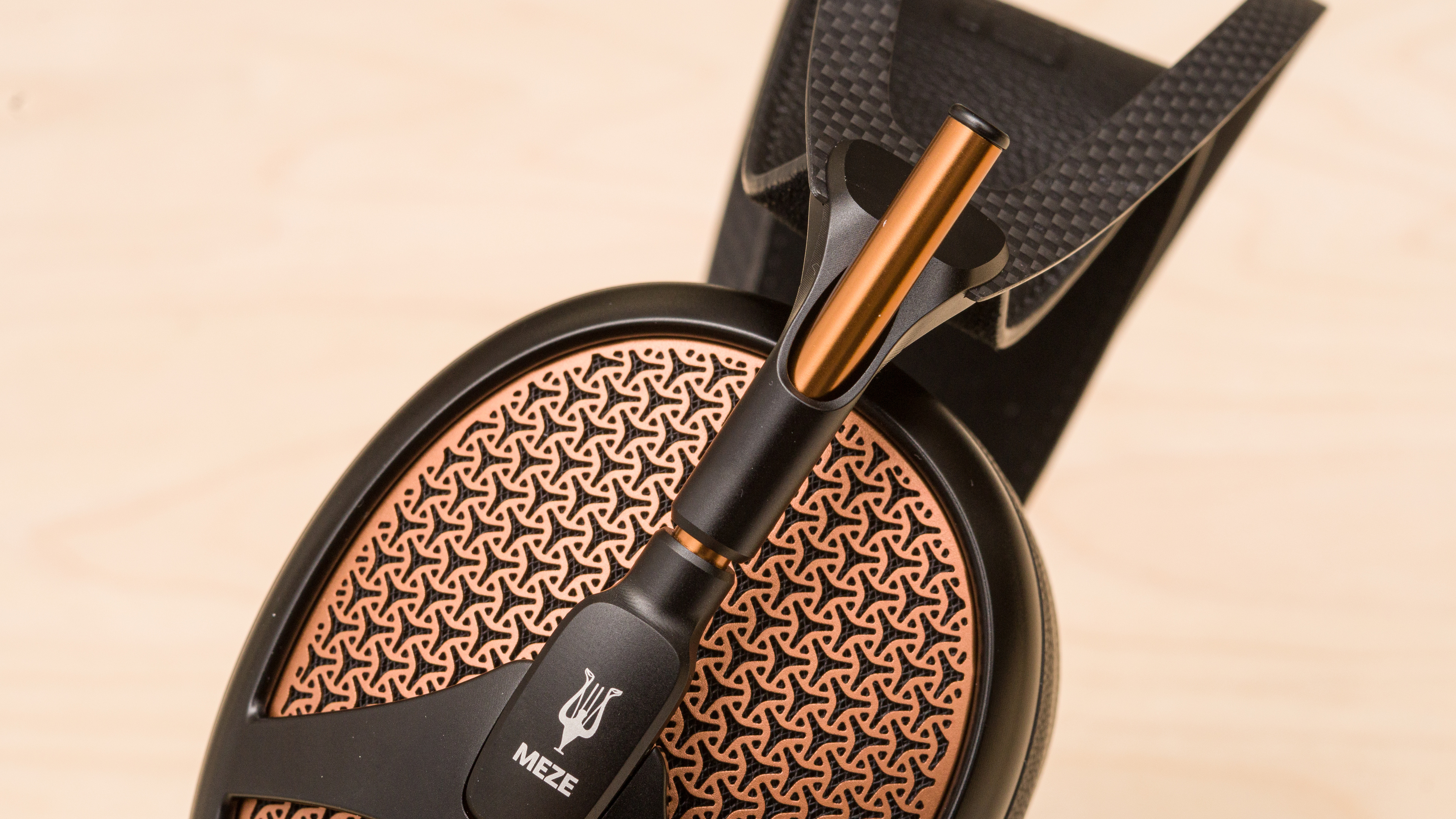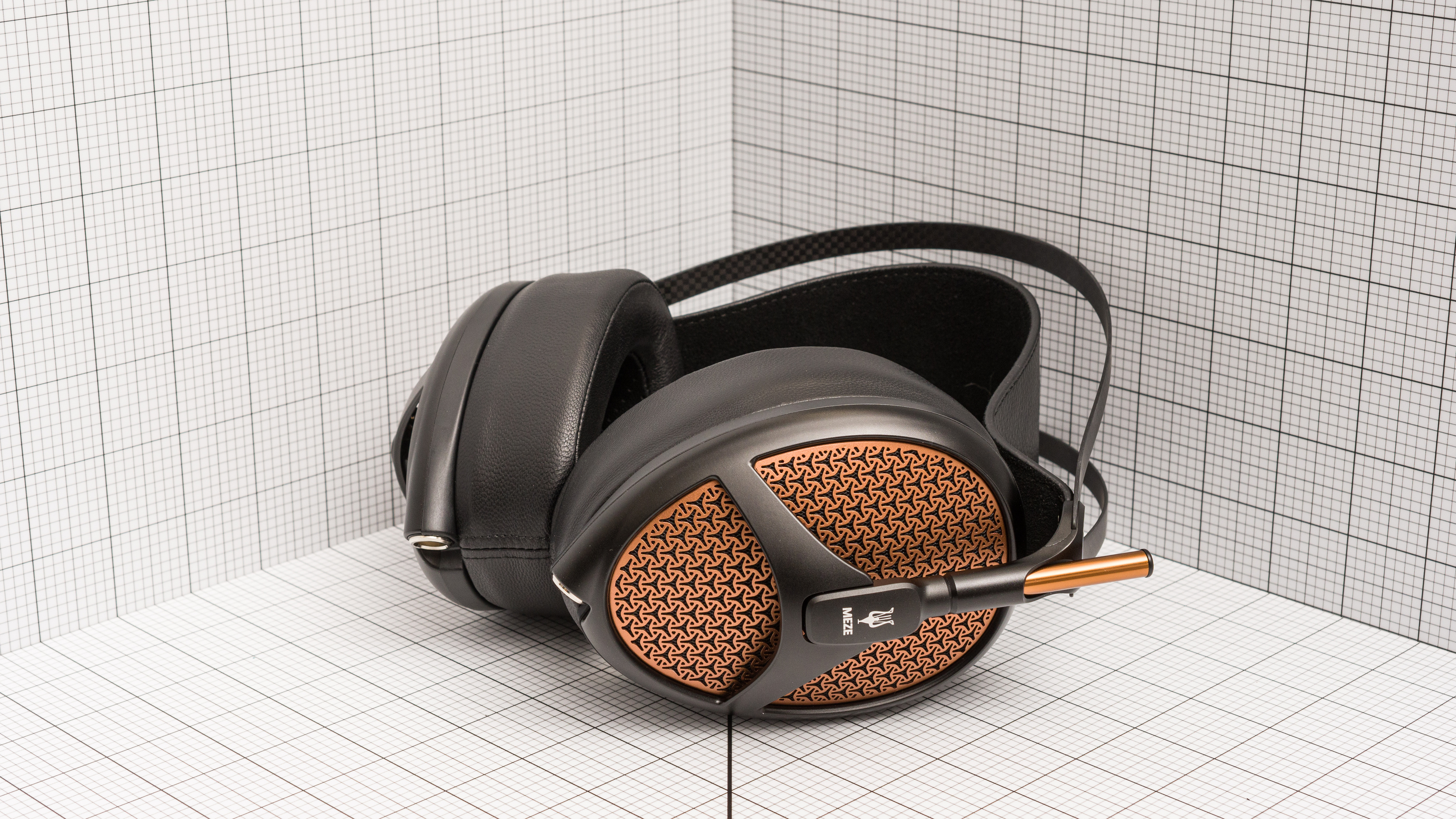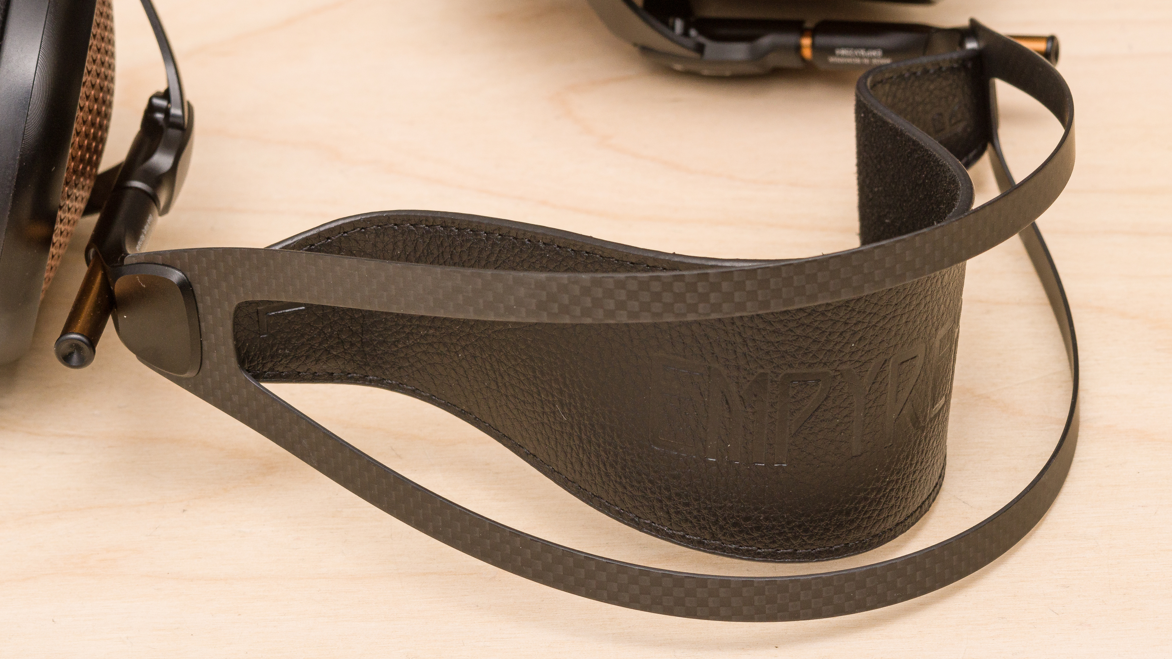 Although the Meze Empyrean are very large and look bulky, each design element is thoughtful and detailed. They're made from premium materials, which shows from their aluminum frame with eye-catching geometric-patterned grilles to their copper hinges. Unlike many other headphones with a ski band headband design like the HiFiMan Arya, their carbon fiber headband and leather headrest has a wave-like look with 'pressure distribution wings', which are advertised to spread the weight of the headphones on your head. They also come with two different sets of earpads: one pair made of leather and another pair made of Alcantara, which is a synthetic fabric with a suede-like feel. They come in two color variants: 'Jet Black' and 'Black Copper'.