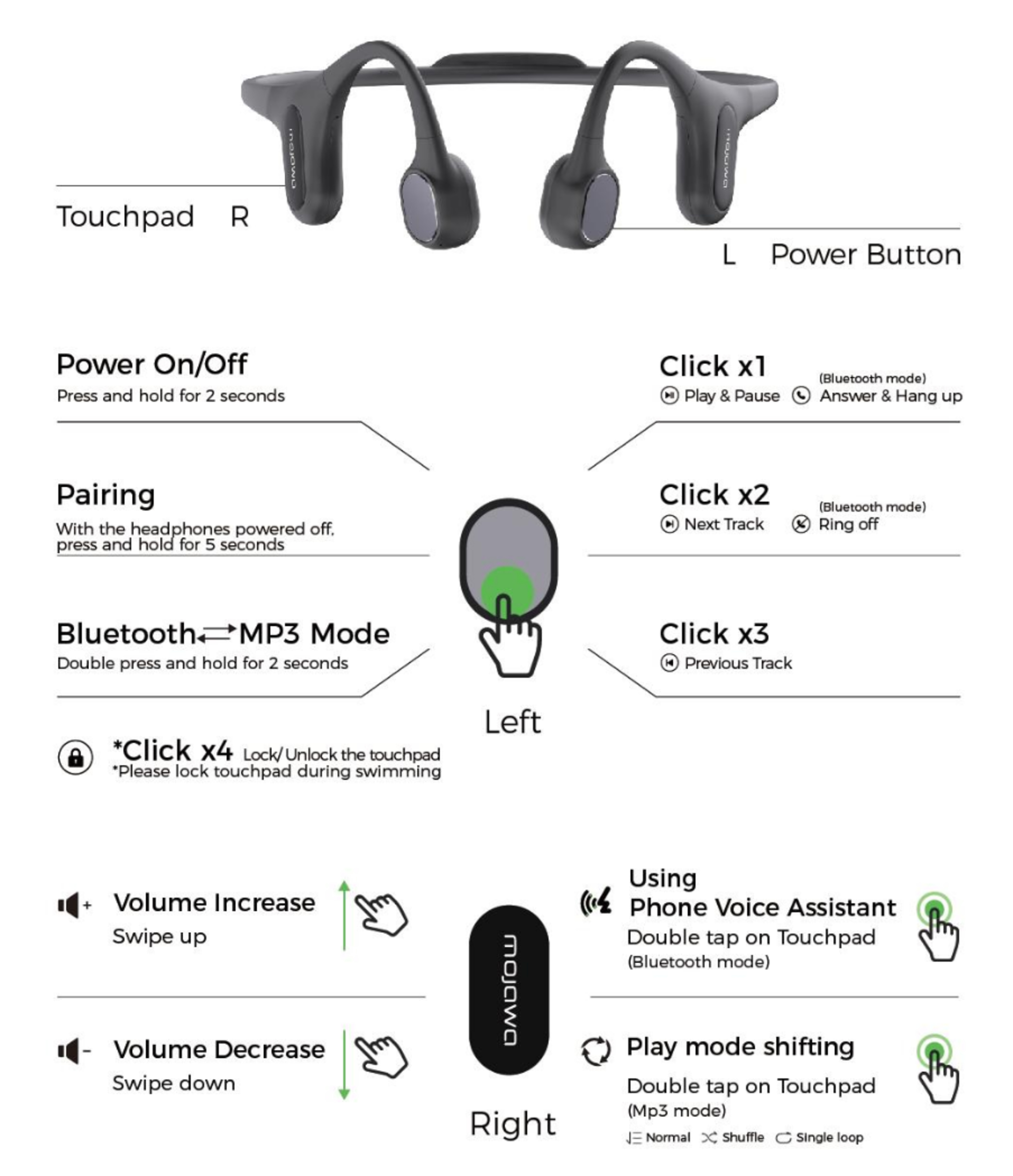 The controls on the Mojawa Run Plus are okay. They consist of a multi-function button handling playback on the left side and a touch-sensitive pad on the right side (where the logo is) for volume swipes and additional controls. You can see the control layout, which requires some memorization because most commands are multiple presses. To access the internal storage and stop using Bluetooth audio, you'll click the left button four times and lock the controls, and repeat to revert back to Bluetooth audio and unlock the buttons.