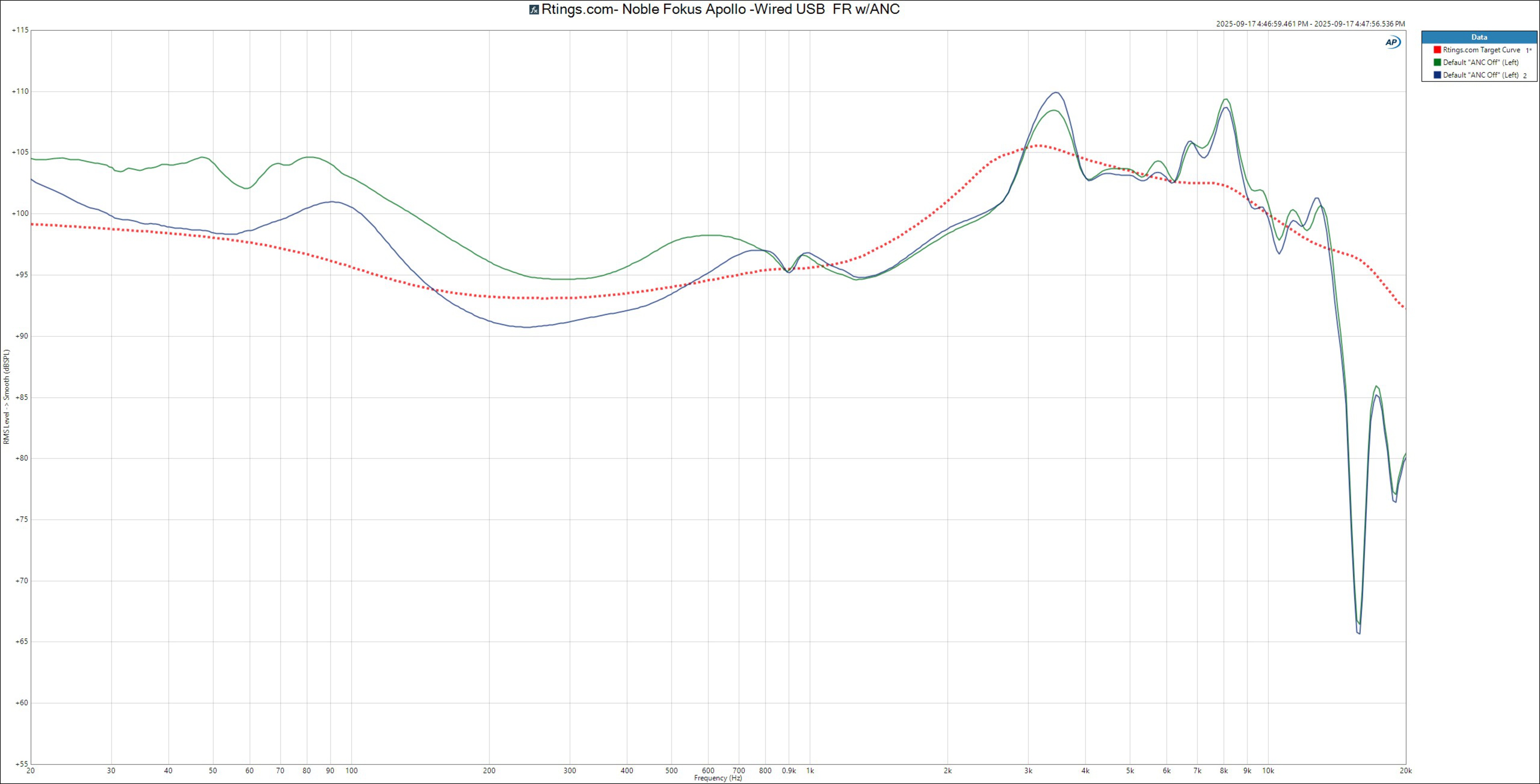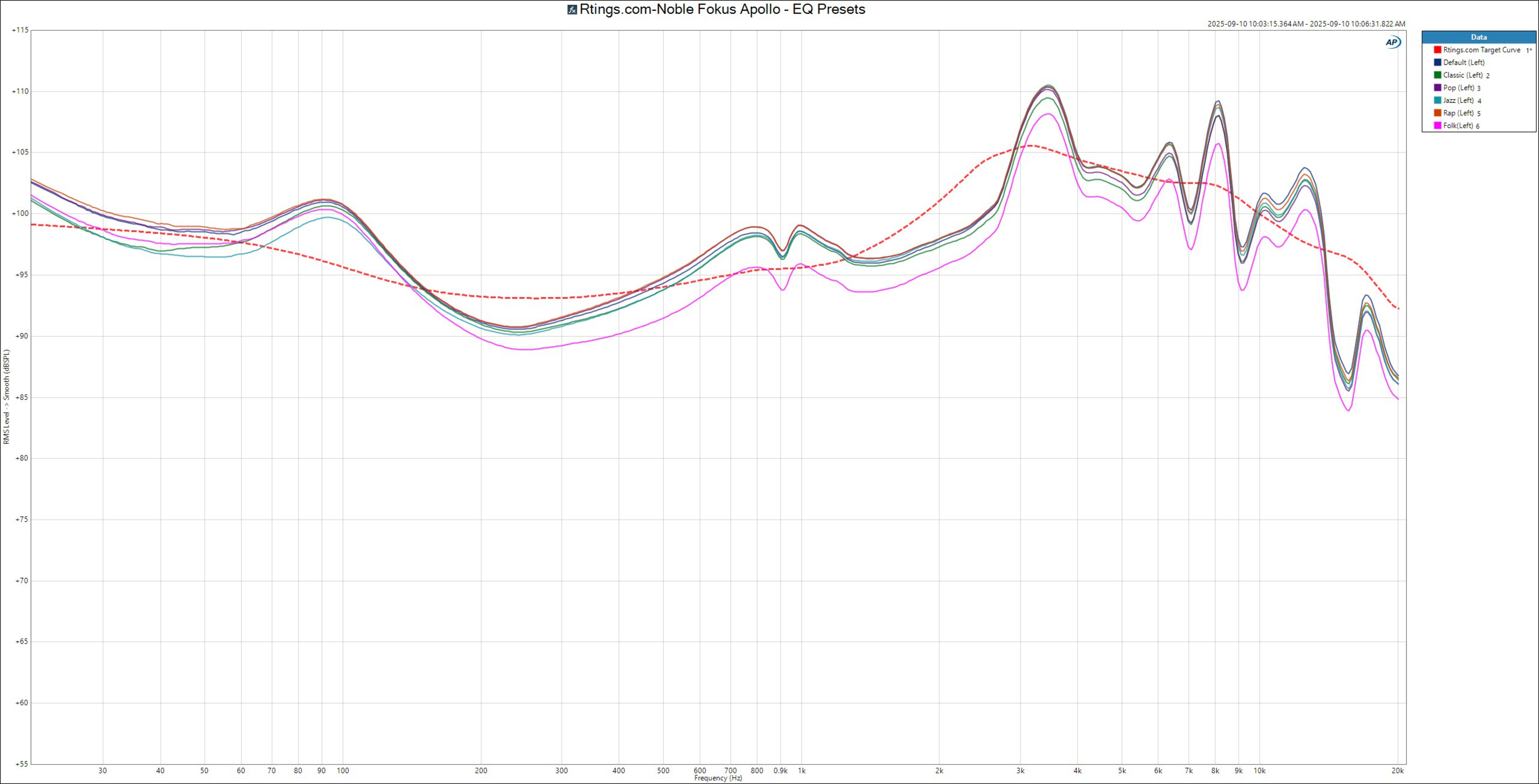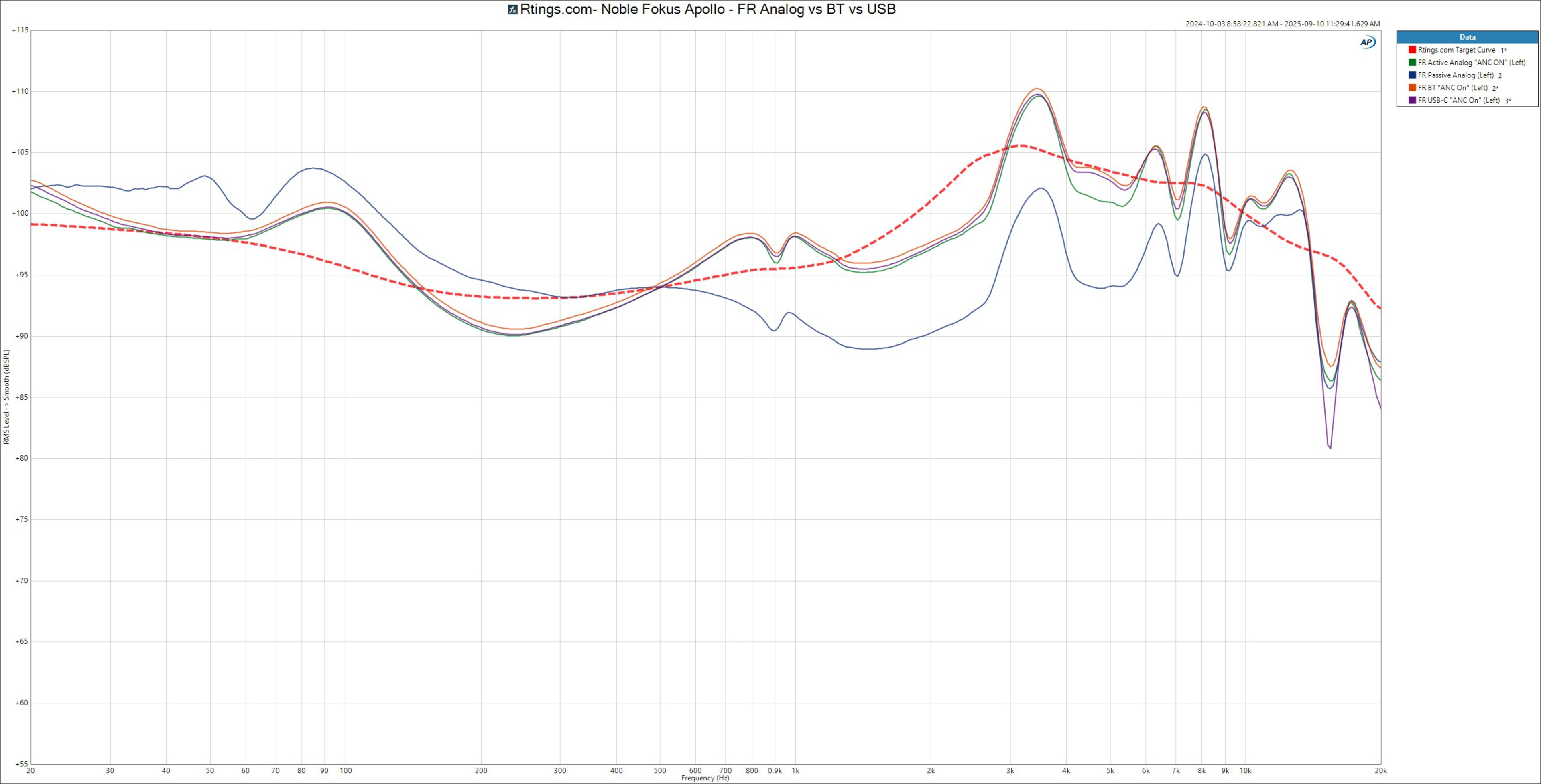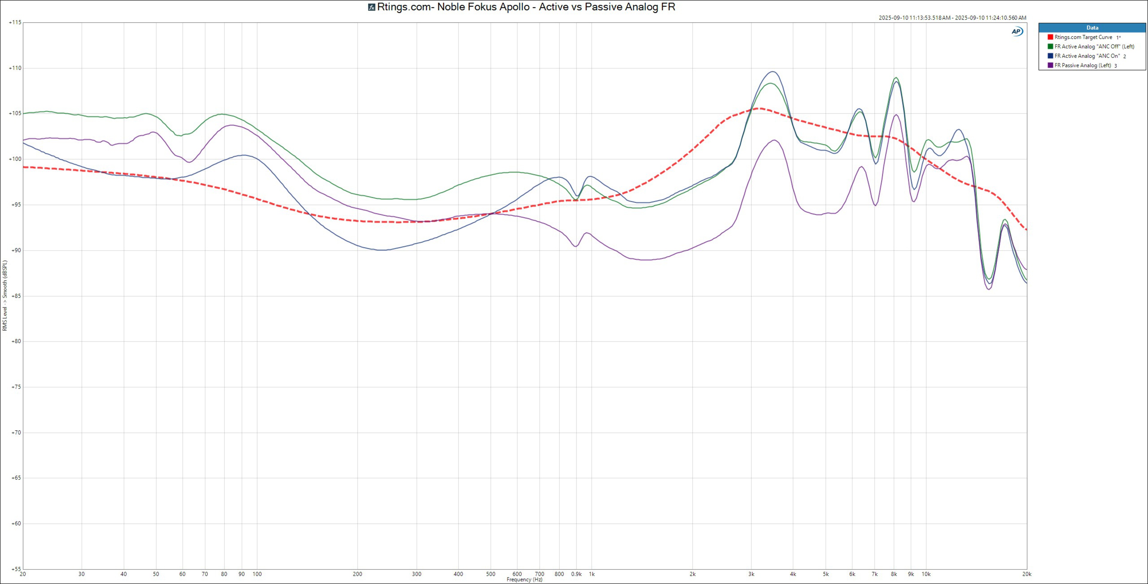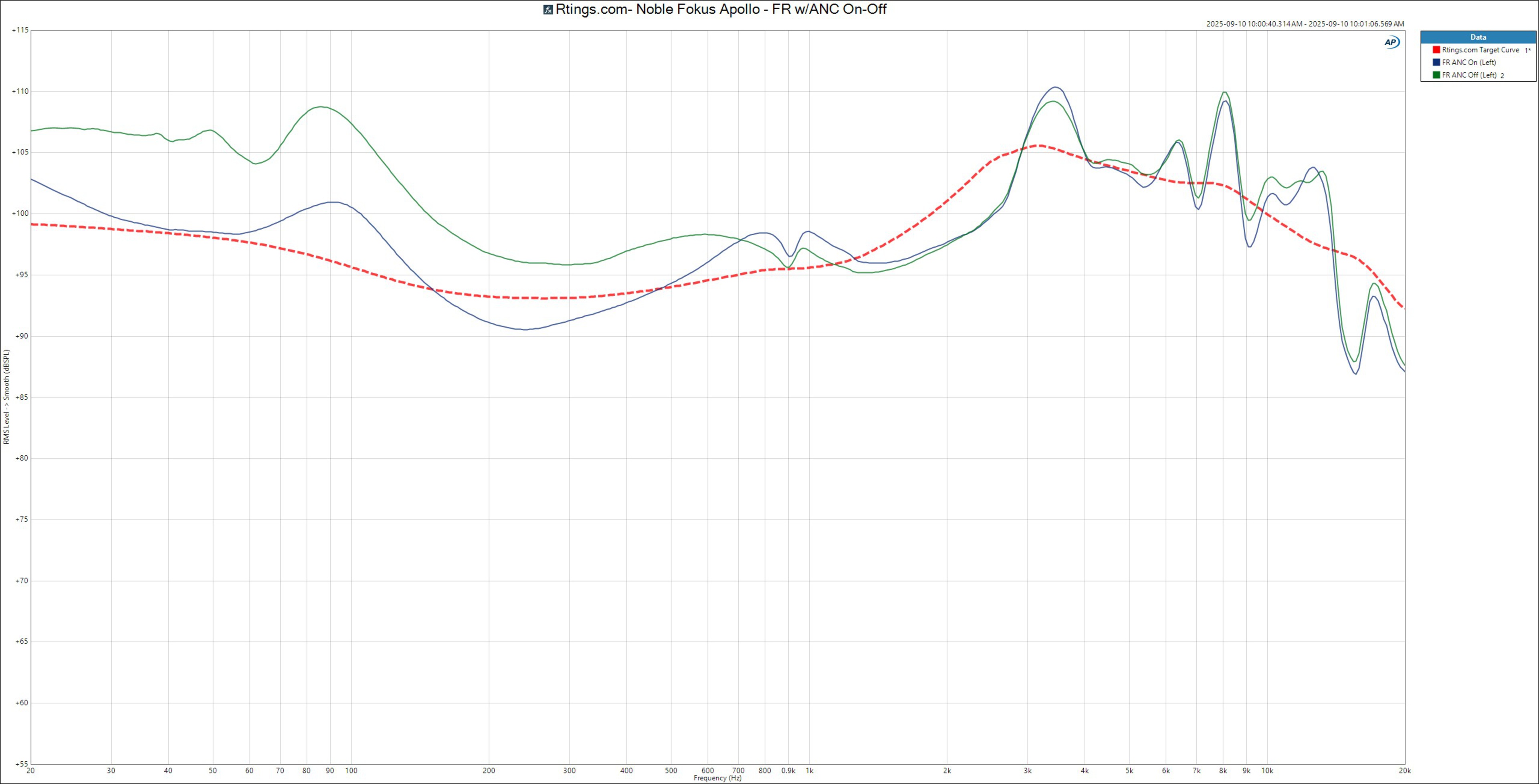 The Noble FoKus Apollo have great frequency response consistency. Most people's listening experience will resemble our frequency response measurements. However, if you wear glasses, you may notice less pronounced sub-bass and slightly more mid-bass emphasis.