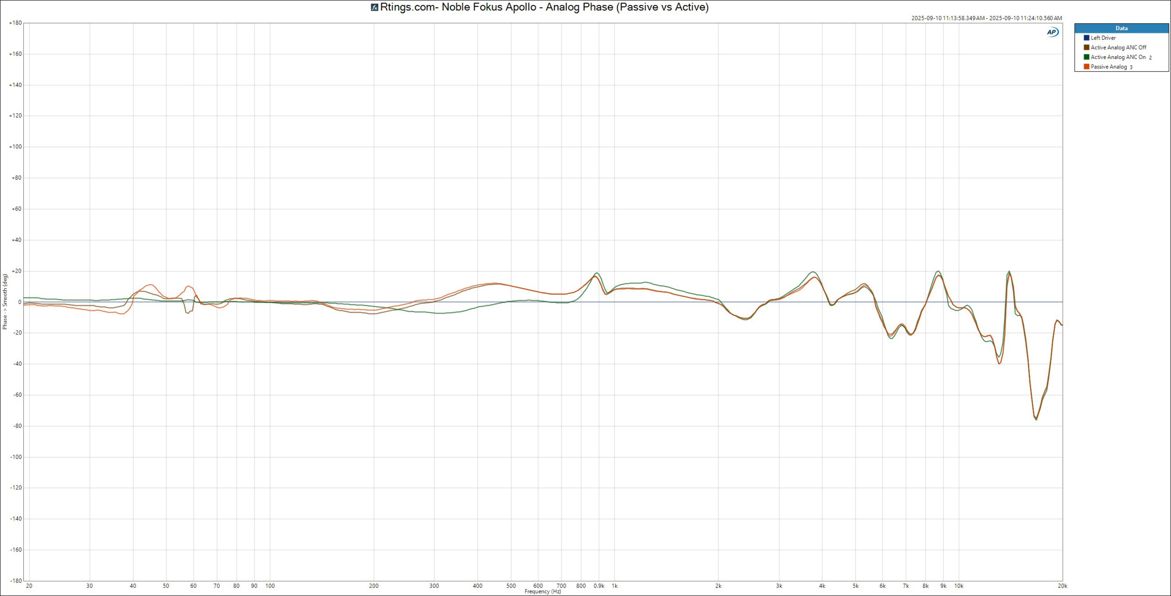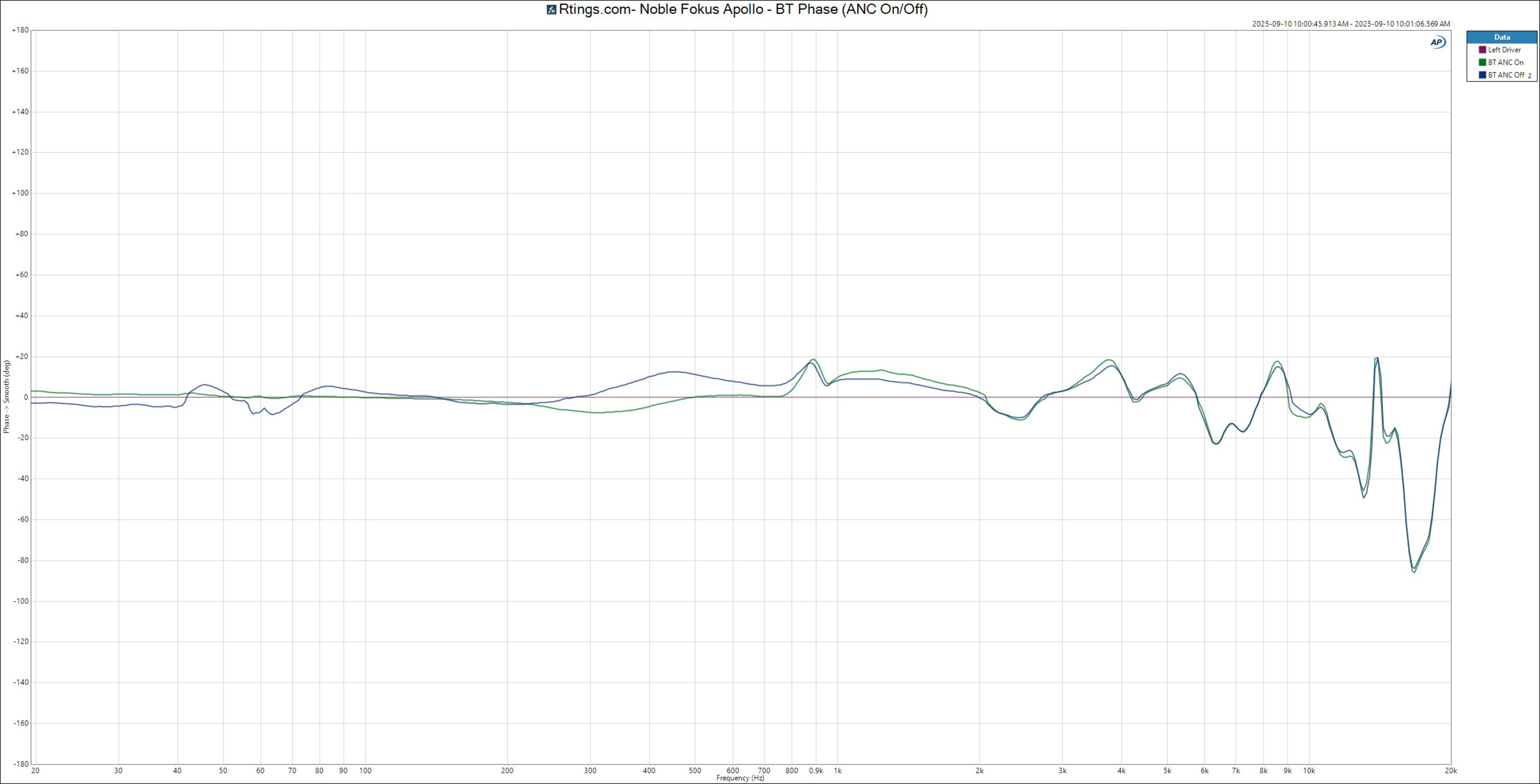 Matching the Focal Bathys Wireless, the Noble have an onboard DAC (digital-to-analog converter) and support Bluetooth, USB-C, and analog connections. While each connection type performs similarly under the same conditions (powered on, ANC on), the headphones' frequency response varies depending on the state of ANC (or power) for analog, USB-C, and Bluetooth connections. In further investigations, we also noticed that phase response mismatch was more pronounced in some ANC off configurations.