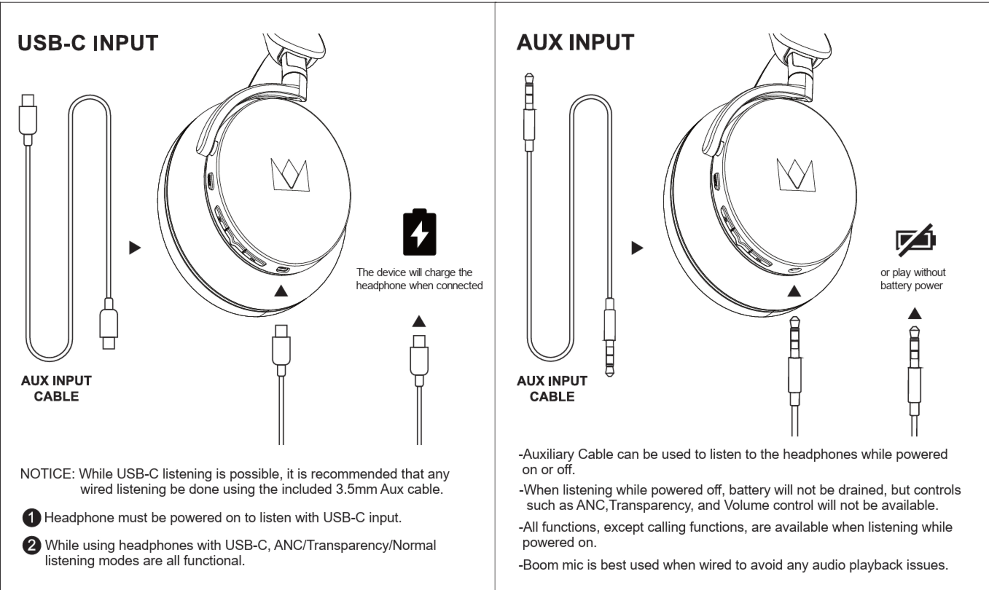 These headphones support two wired connections via their USB-C (1.22 m/4.00 ft) and 1/8" TRRS (1.24 m/4.06 ft) cables. While active (powered on), both connections have low latency, but you can use them passively (via analog) for even lower audio latency (0.24 ms). Their microphone (boom or integrated) also works with most devices over either connection. That said, Noble recommends using an analog connection and their boom microphone.