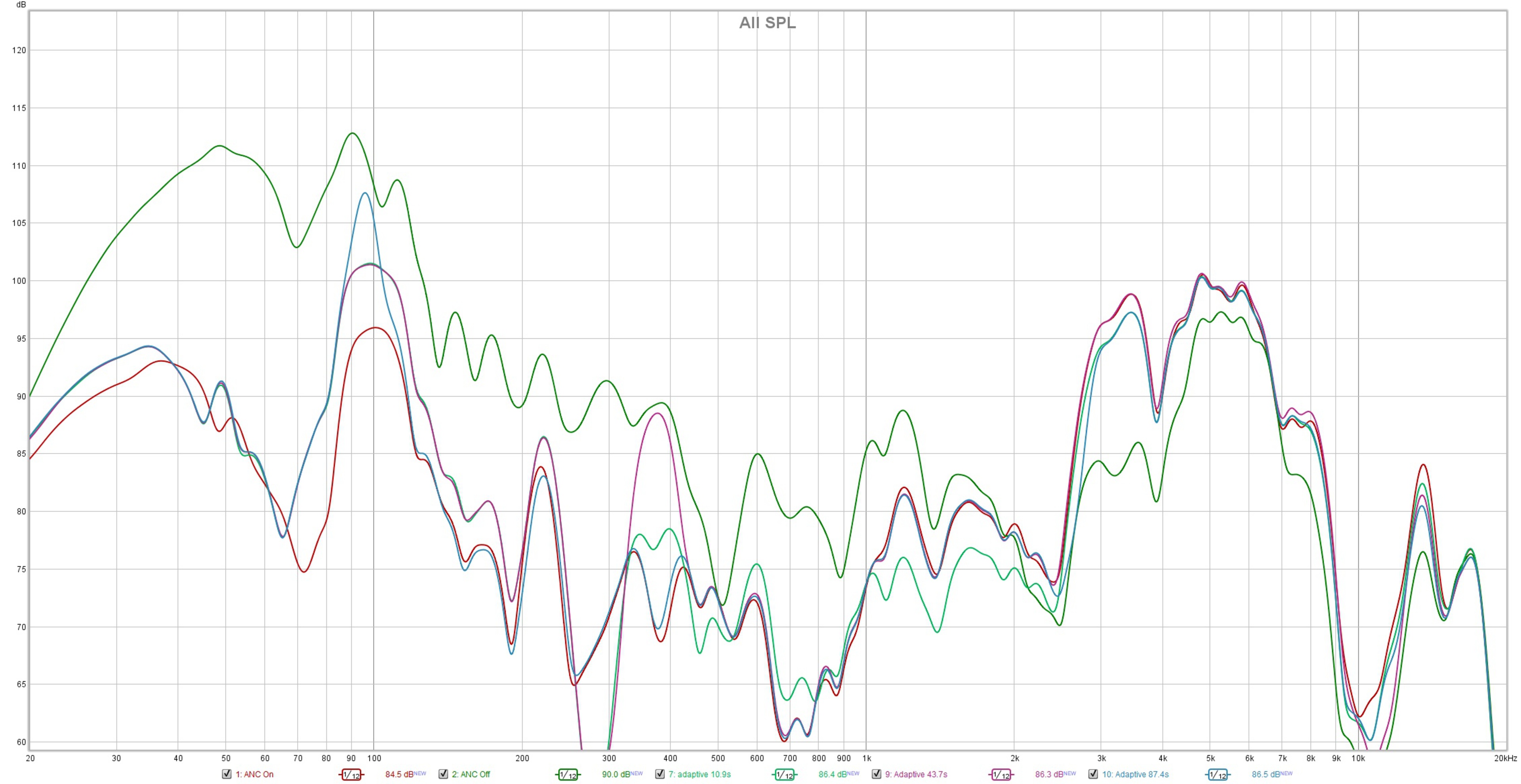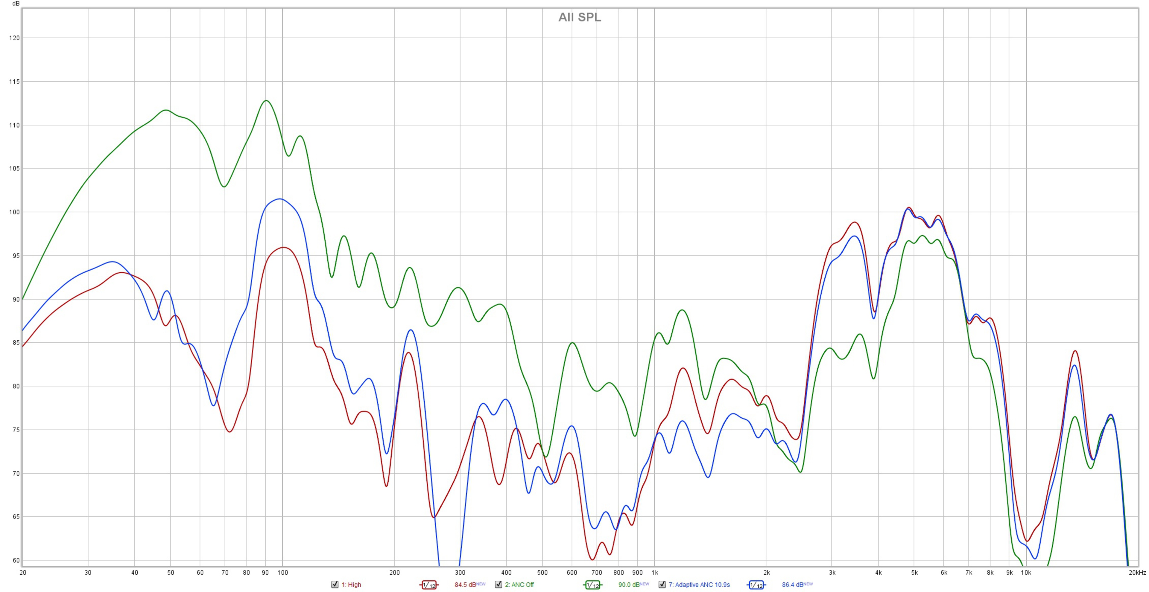 Noise isolation performance is decent. You can set the ANC to 'High/Mid/Low' or 'Adaptive'. We took measurements for 'High' as well as 'Adaptive', and found they perform about the same. We also tried lengthening our sweep to see if this made the 'Adaptive' mode work better but didn't find any significant changes.