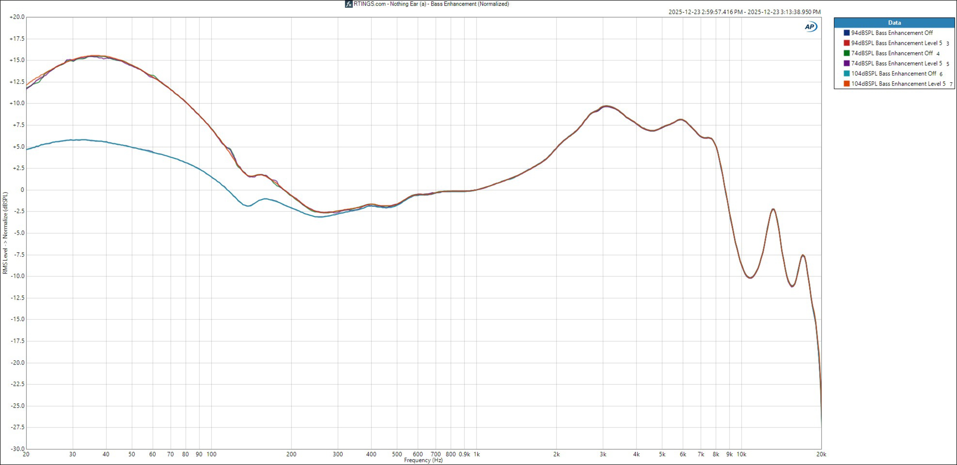 That said, if you want even more low-end thump or prefer to hear more breathy details in the vocals of your favorite chanteuse, you can use their custom EQ or try out their EQ presets. In addition to EQ, they have a 'Bass Enhancement' mode, which applies a loudness contour to the low-end response in five incremental strengths. We measured its effect on the frequency response across a range of volumes (at level 5) and found that it applies the same level of contouring regardless of the volume. The earbuds sound very slightly different with ANC turned on or off.